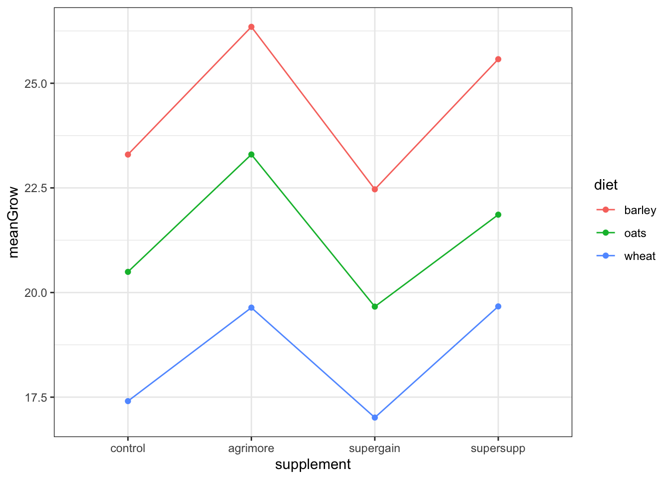 since the lines are about parallel with each other, then we can probably rule out interaction effects. This means the effect of supplement probably does not depend on the effect of diet