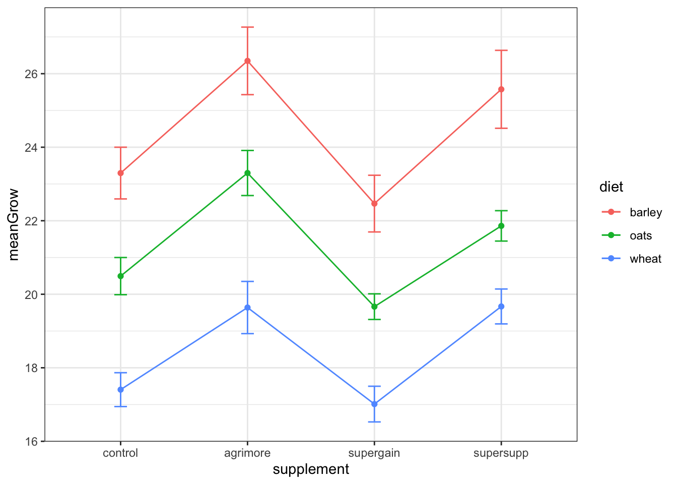 ## lm(formula = gain ~ diet * supplement, data = growth.moo)