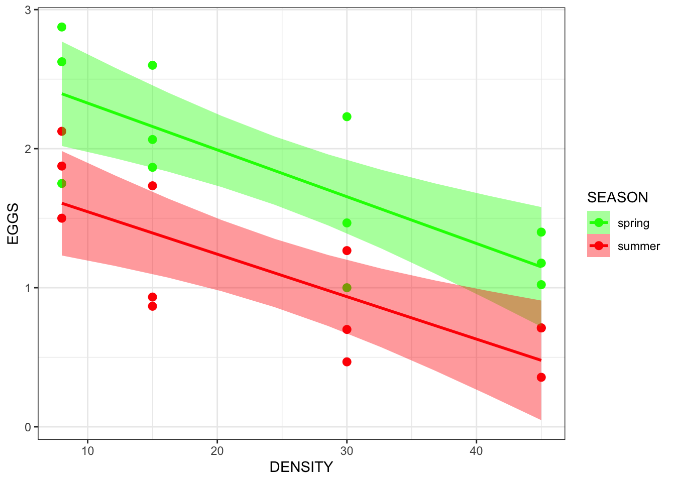 - We can use the model eggs(spring) = 2.66 - 0.033 x DENSITY to accomplish this
