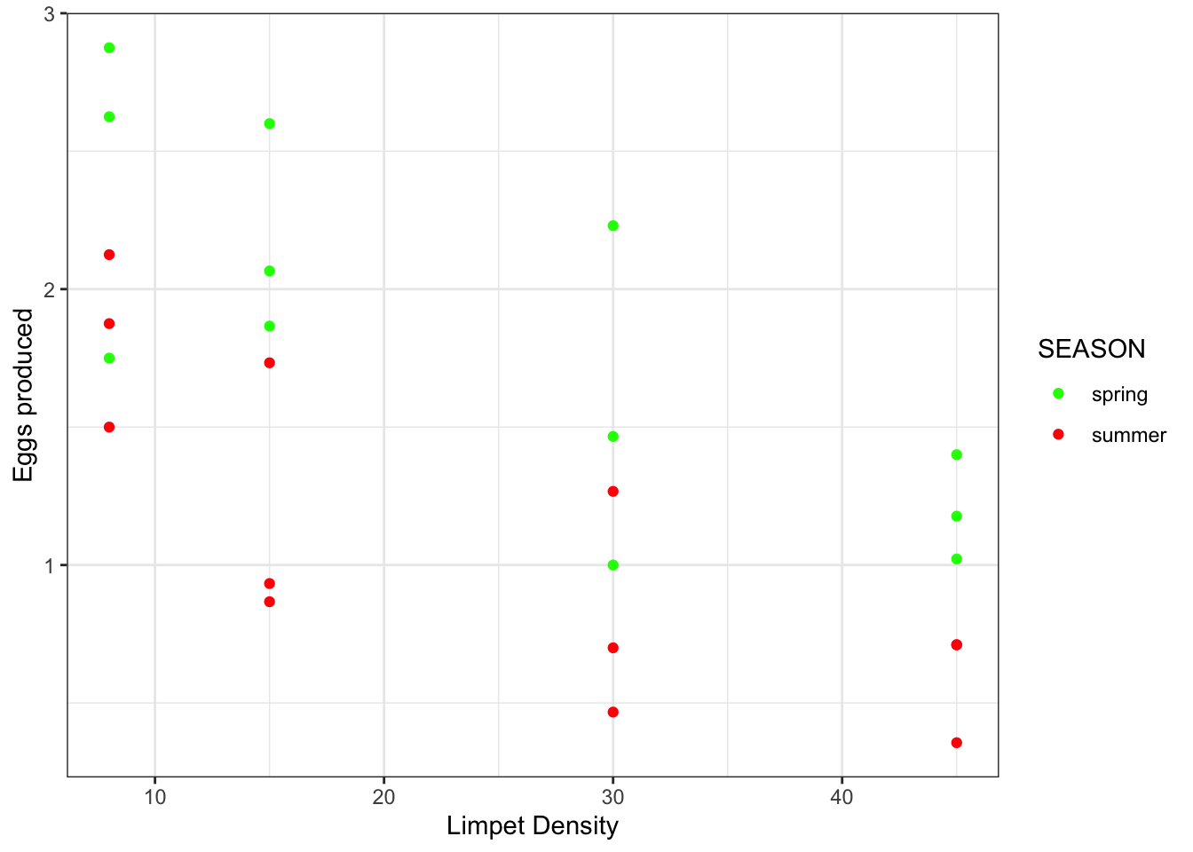 - In the summmer, the density dependence was only 0.003 units (egg prod/density) lower than in spring which was found not to be statistically significant
