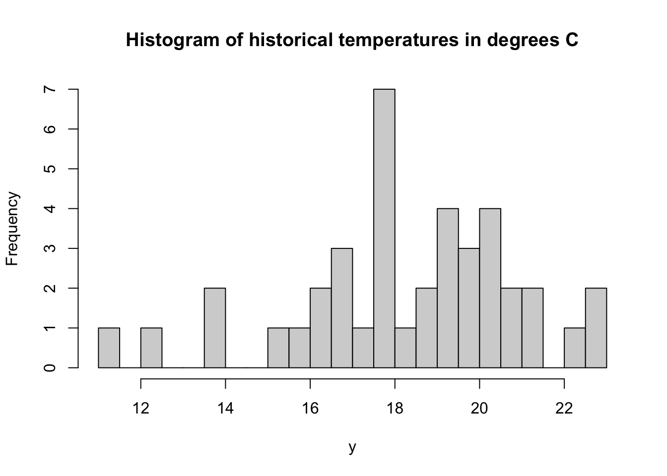 hist(y, breaks = 20, main = "Histogram of historical temperatures in degrees C")
