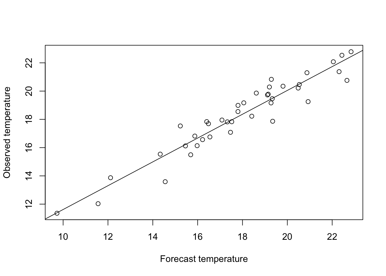 plot(x,y, xlab = "Forecast temperature", ylab = "Observed temperature")