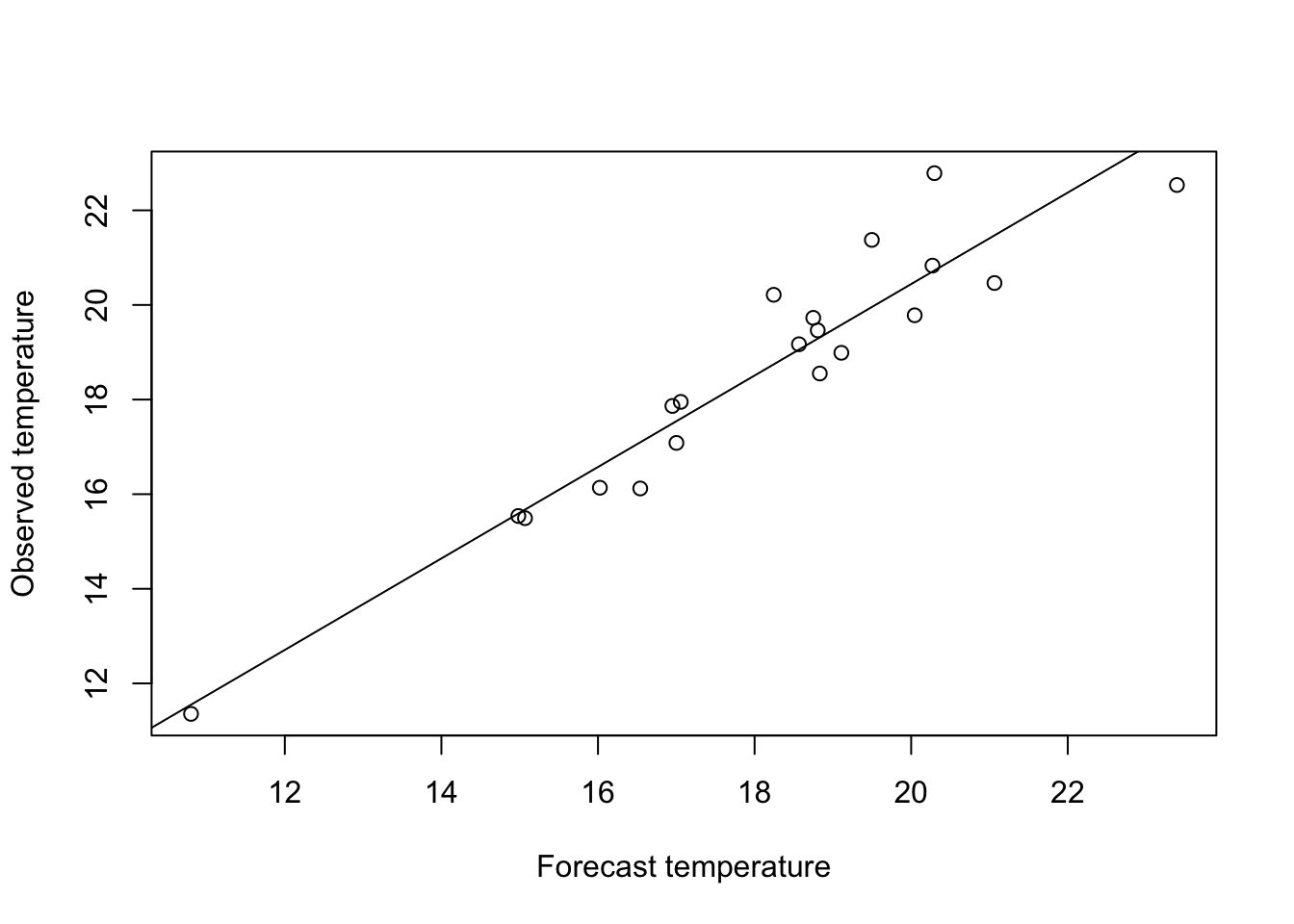 plot(x,y, xlab = "Forecast temperature", ylab = "Observed temperature")