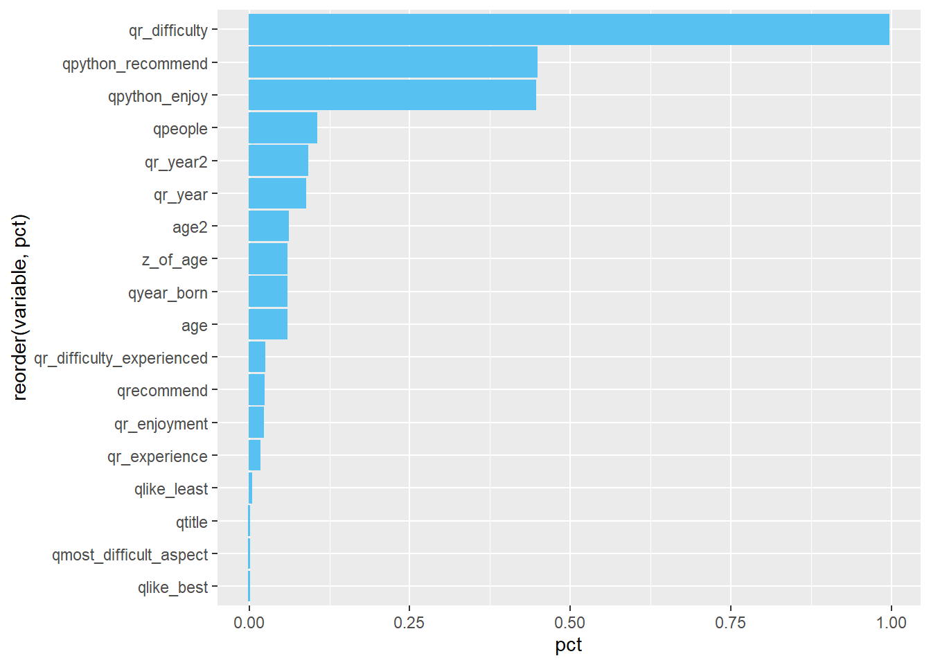 missing %>%- use the “missing” data framepivot_longer(qtime:age2, names_to = "variable", values_to = "pct") %>%- our “missing” data frame had 1 row and 67 columns. By usingpivot_longer, we “flipped” our data frame so it had 2 columns (“variable” and “pct”) and 67 rows. This is easier to visualize.filter(pct > 0) %>%- we removed any columns with no missing datafilter(!str_detect(variable, "use_")) %>%we removed any columns that started with “use_” because those are check-all questions.