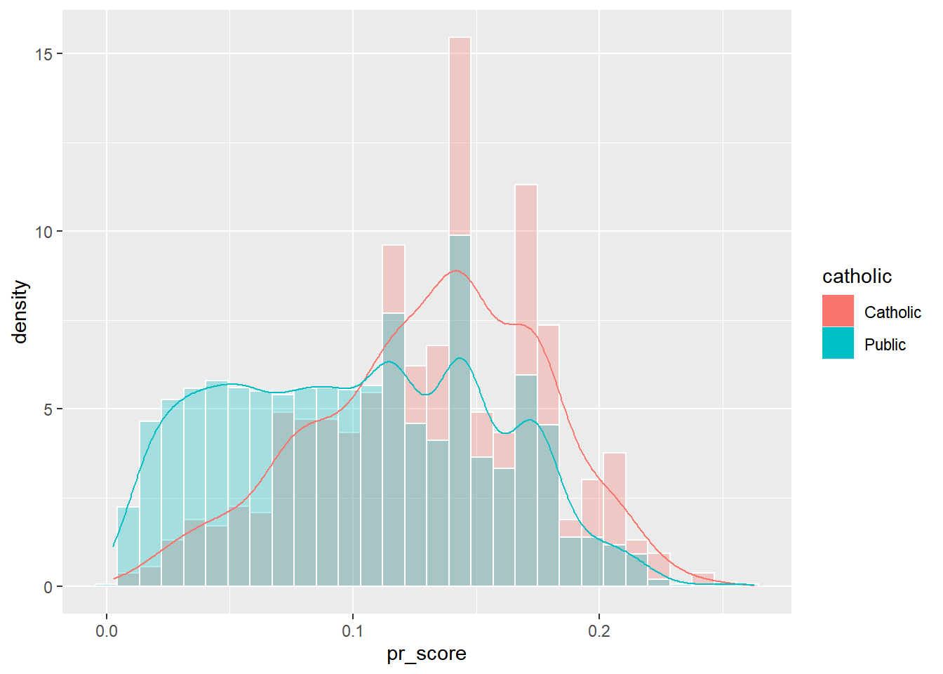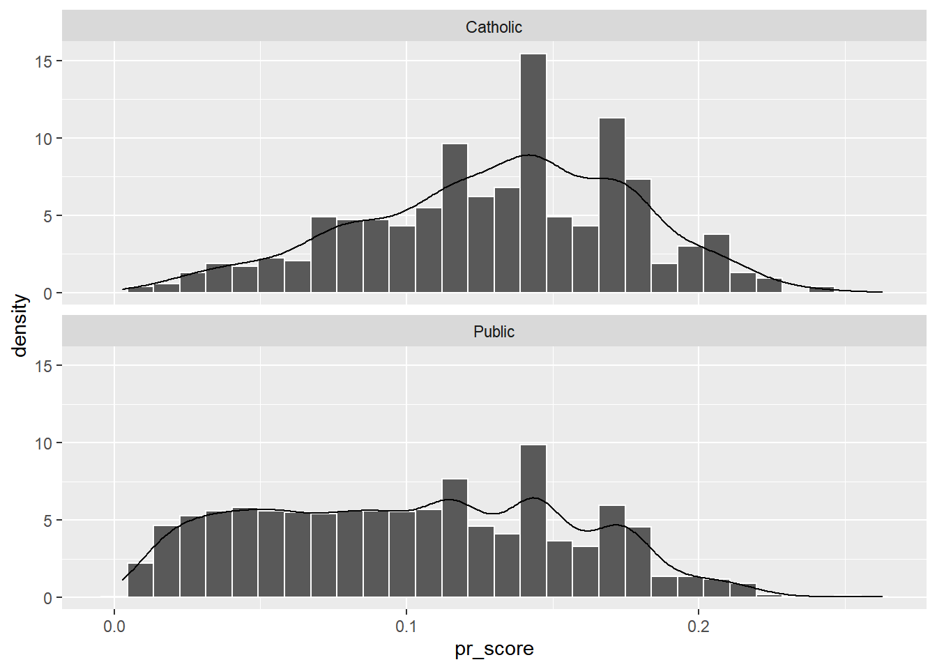 summary(nels88_ps)), we can typically only estimate the ATT since we don’t typically include the entire sample. Weighting by the inverse of the propensity score then running the analysis is one way to get the ATE. You can also get ATE from stratification.