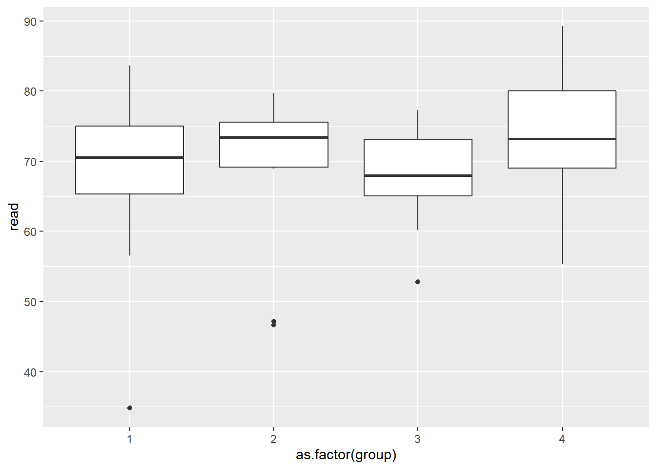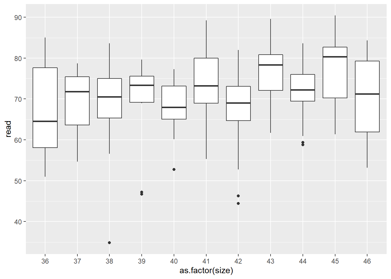 geom_boxplot(aes(x=as.factor(size), y=read))