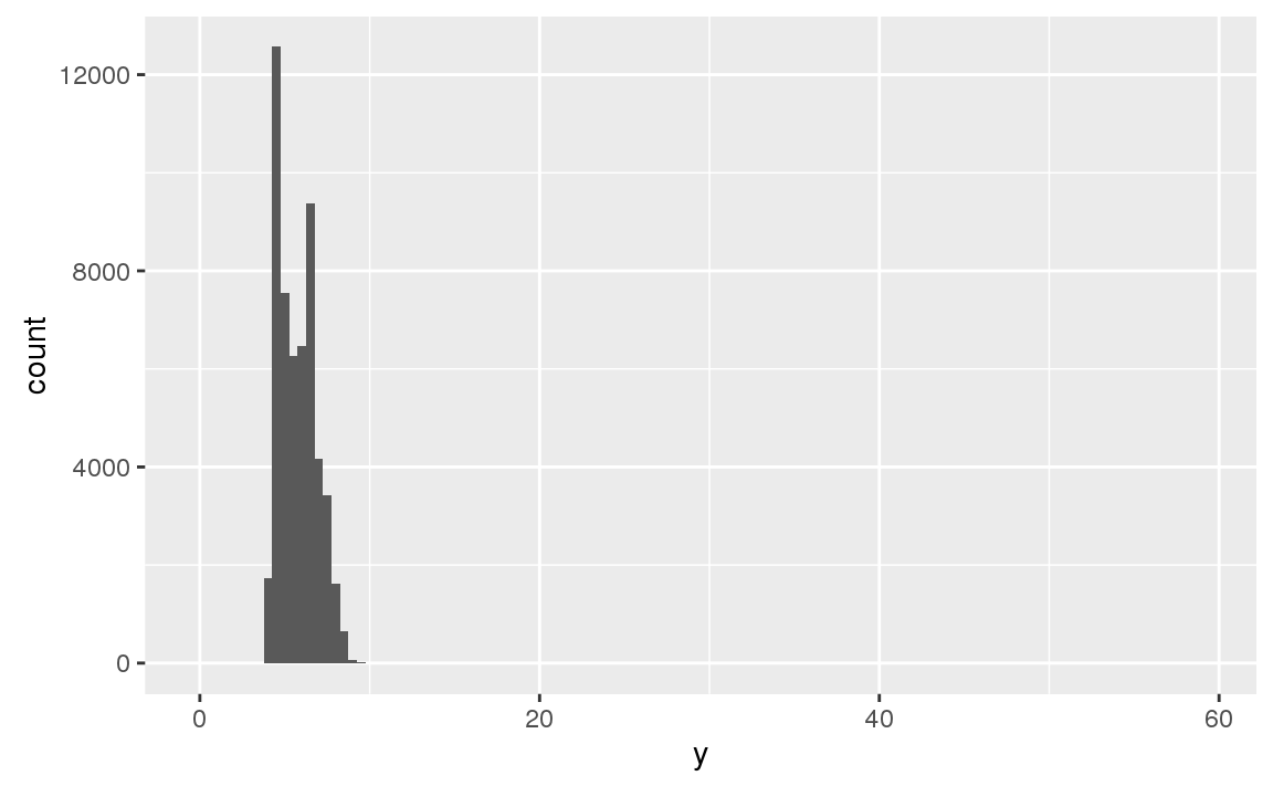 Outliers are observations that are unusual; data points that don’t seem to fit the pattern. Sometimes outliers are data entry errors; other times outliers suggest important new science. When you have a lot of data, outliers are sometimes difficult to see in a histogram. For example, take the distribution of the y variable from the diamonds dataset. The only evidence of outliers is the unusually wide limits on the y-axis.