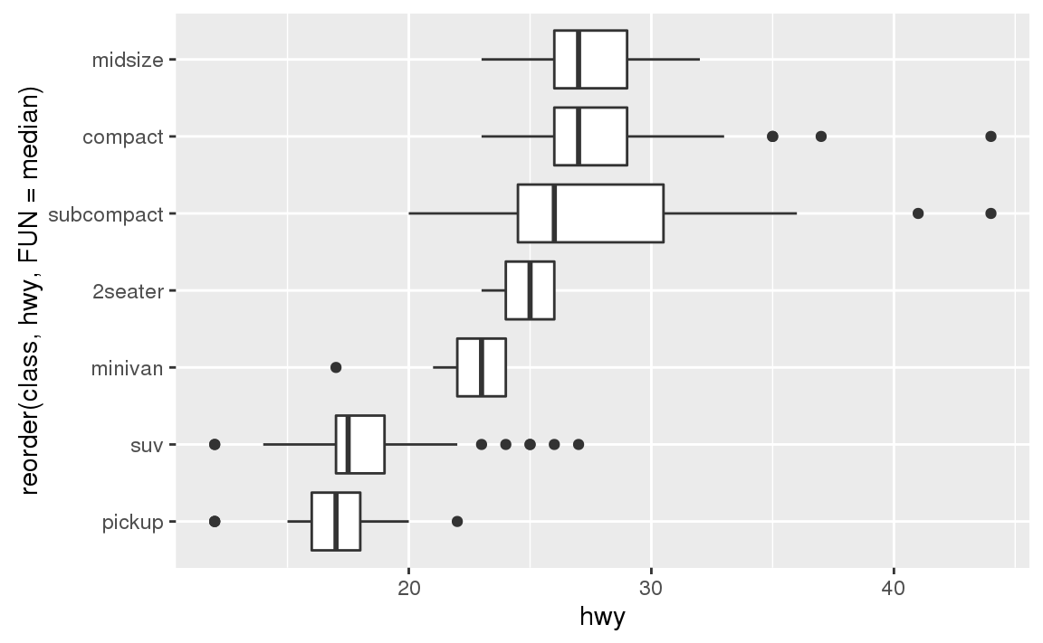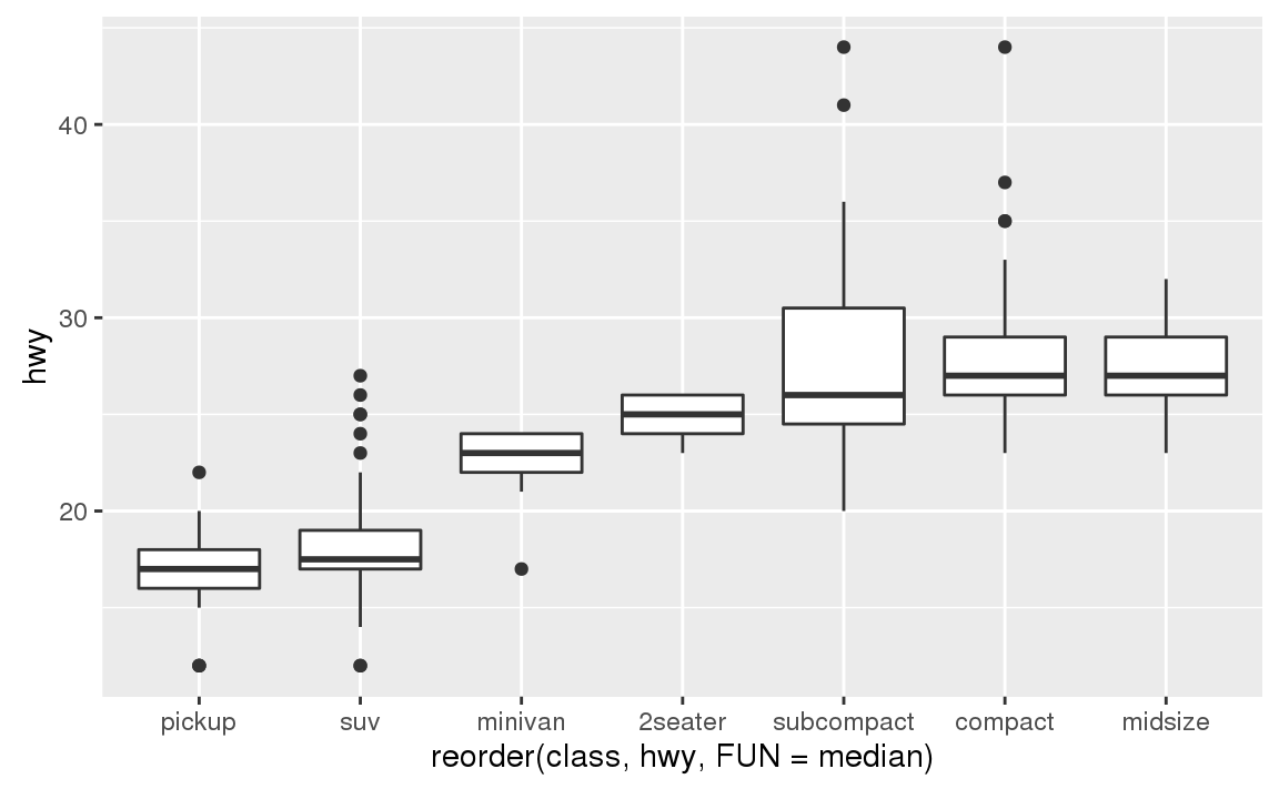 geom_boxplot(mapping = aes(x = reorder(class, hwy, FUN = median), y = hwy))