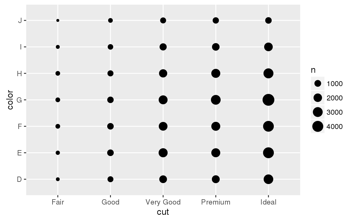 The size of each circle in the plot displays how many observations occurred at each combination of values. Covariation will appear as a strong correlation between specific x values and specific y values.