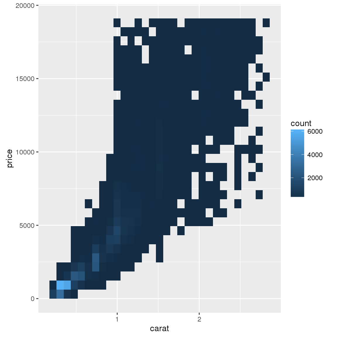geom_bin2d(mapping = aes(x = carat, y = price))