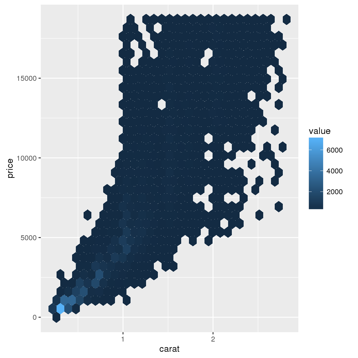 geom_bin2d() and geom_hex() divide the coordinate plane into 2d bins and then use a fill color to display how many points fall into each bin. geom_bin2d() creates rectangular bins. geom_hex() creates hexagonal bins. You will need to install the hexbin package to use geom_hex().