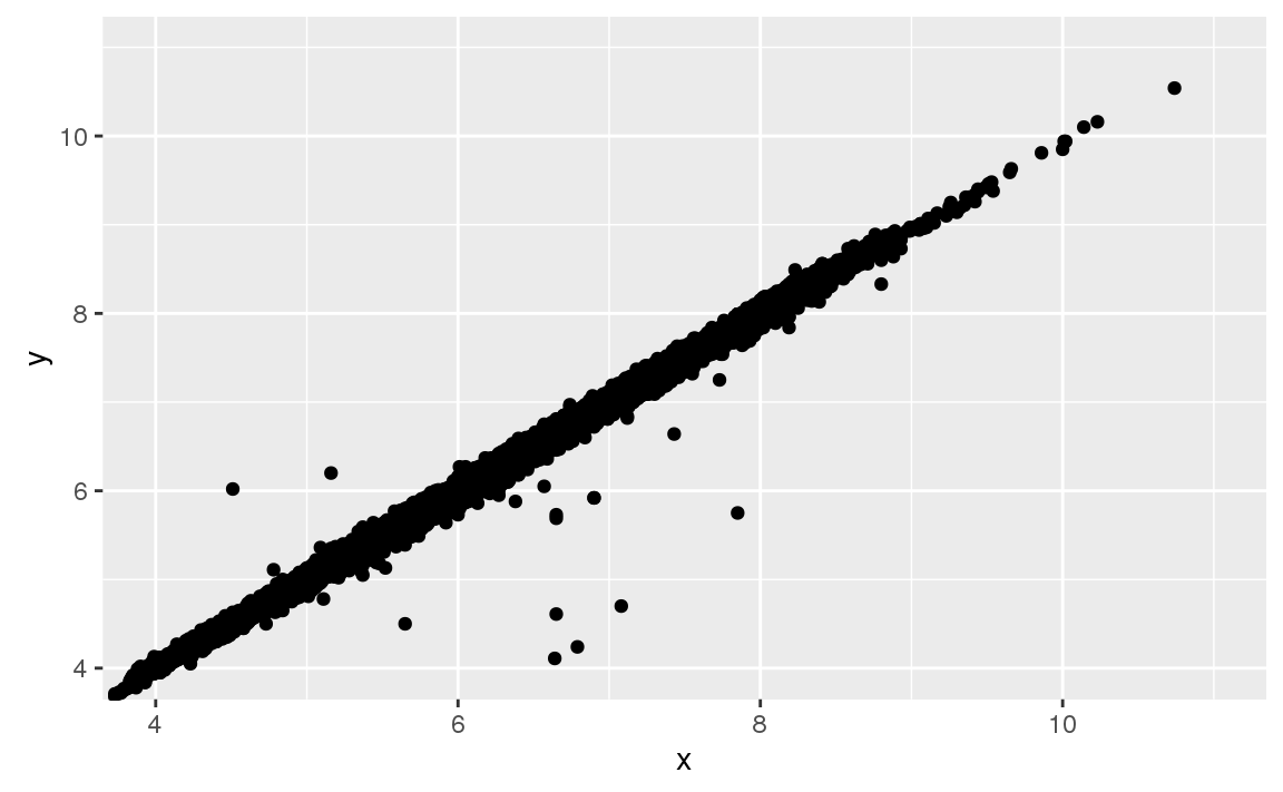 xandyvalues, which makes the points outliers even though theirxandyvalues appear normal when examined separately.ggplot(data = diamonds) + geom_point(mapping = aes(x = x, y = y)) + coord_cartesian(xlim = c(4, 11), ylim = c(4, 11))