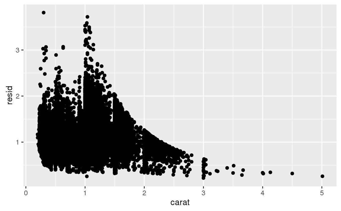 Models are a tool for extracting patterns out of data. For example, consider the diamonds data. It’s hard to understand the relationship between cut and price, because cut and carat, and carat and price are tightly related. It’s possible to use a model to remove the very strong relationship between price and carat so we can explore the subtleties that remain. The following code fits a model that predicts price from carat and then computes the residuals (the difference between the predicted value and the actual value). The residuals give us a view of the price of the diamond, once the effect of carat has been removed.