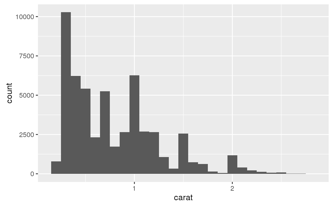 #> # ... with 5 more rowsA histogram divides the x-axis into equally spaced bins and then uses the height of a bar to display the number of observations that fall in each bin. In the graph above, the tallest bar shows that almost 30,000 observations have a carat value between 0.25 and 0.75, which are the left and right edges of the bar.