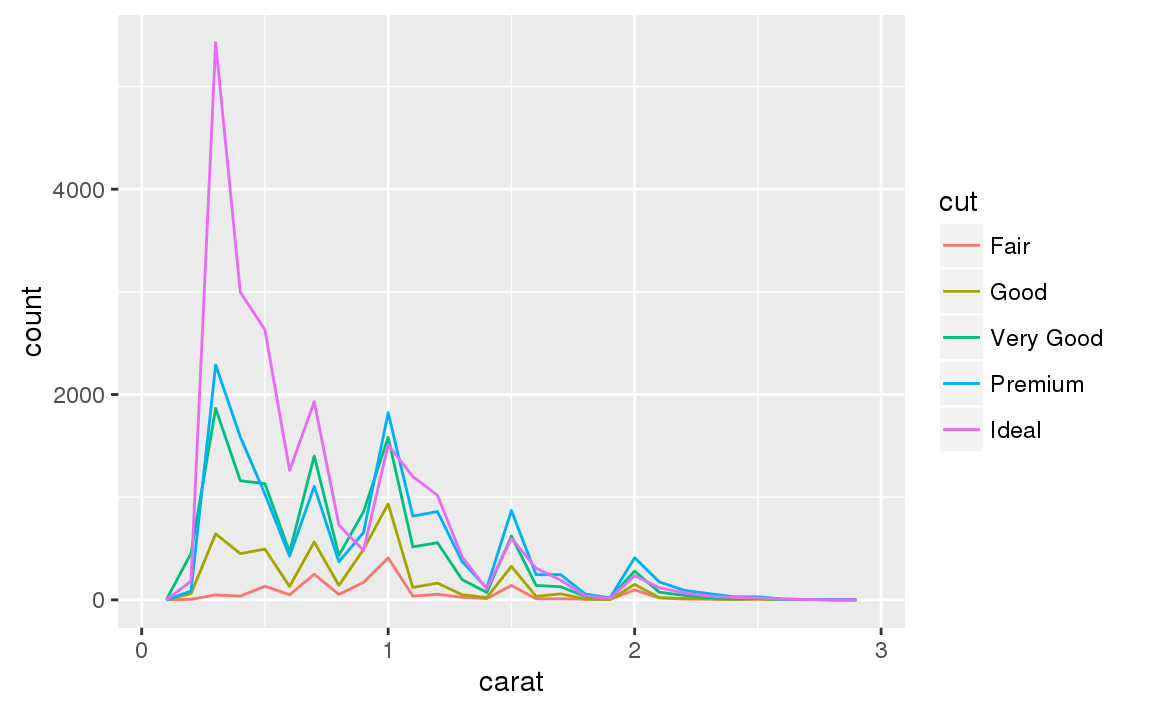 ggplot(data = smaller, mapping = aes(x = carat, colour = cut)) +