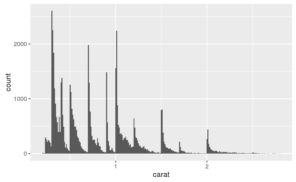 You can set the width of the intervals in a histogram with the binwidth argument, which is measured in the units of the x variable. You should always explore a variety of binwidths when working with histograms, as different binwidths can reveal different patterns. For example, here is how the graph above looks when we zoom into just the diamonds with a size of less than three carats and choose a smaller binwidth.