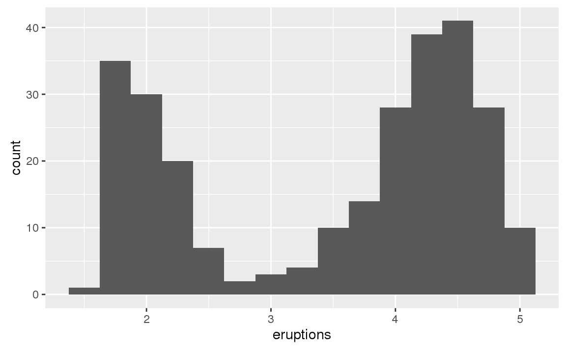 ggplot(data = faithful, mapping = aes(x = eruptions)) +