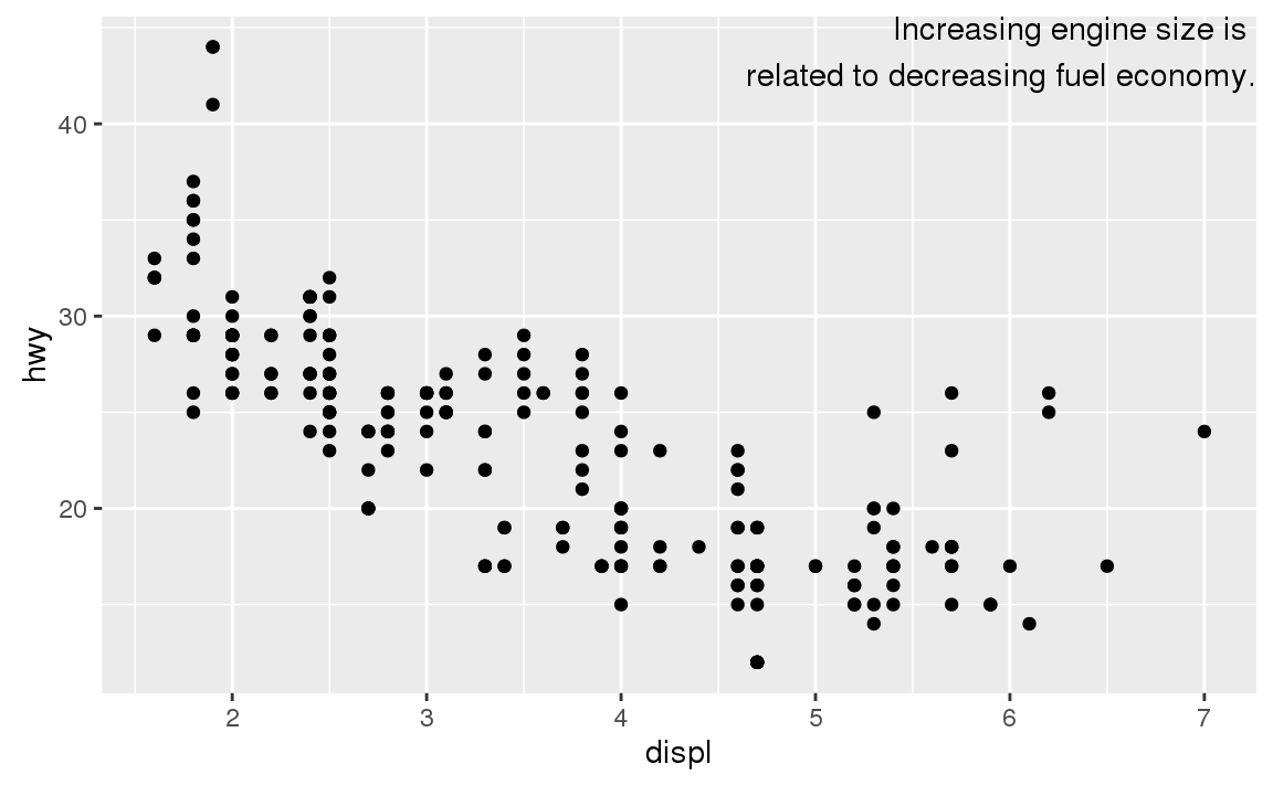 If you want to place the text exactly on the borders of the plot, you can use +Inf and -Inf. Since we’re no longer computing the positions from mpg, we can use tibble() to create the data frame:
