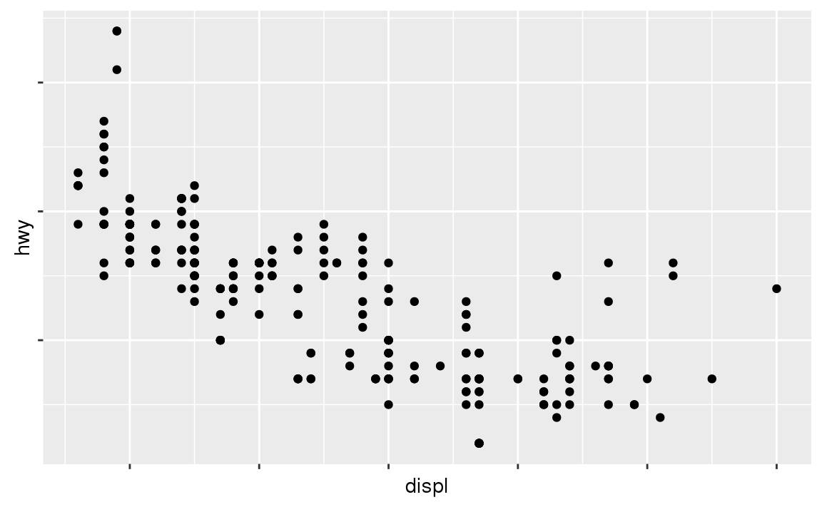 ggplot(mpg, aes(displ, hwy)) + geom_point()