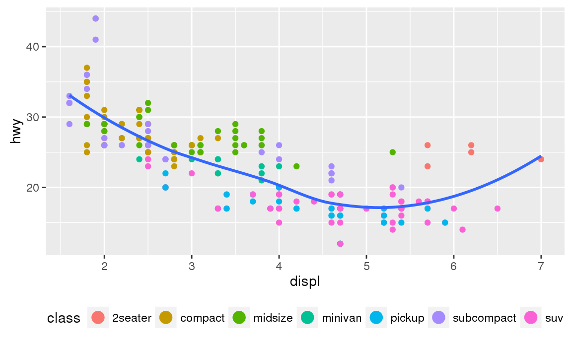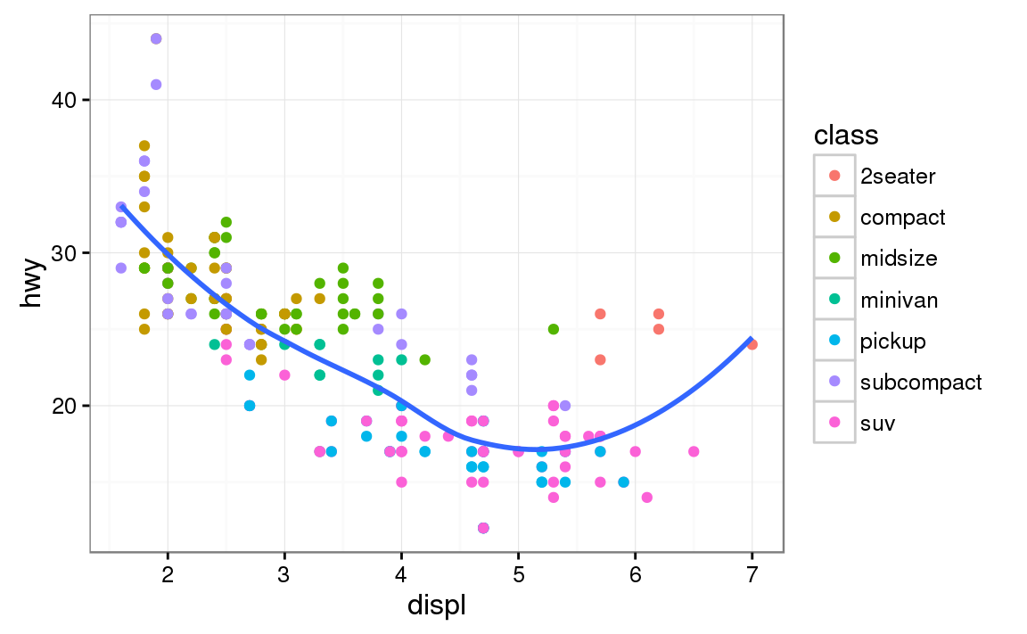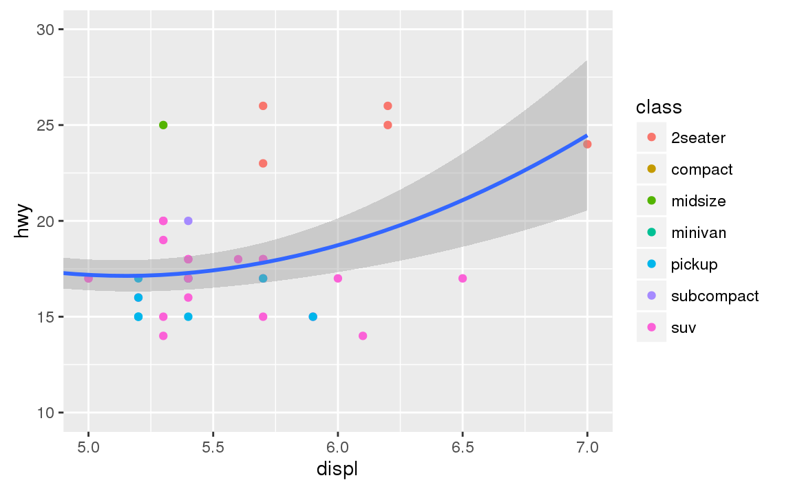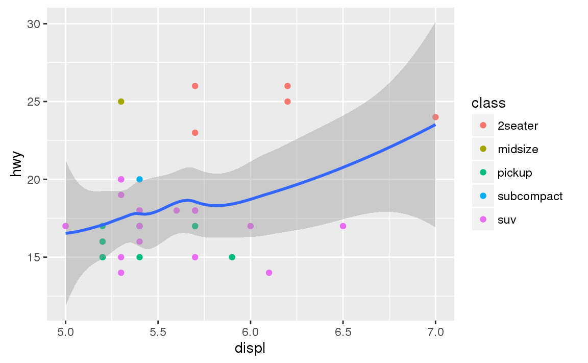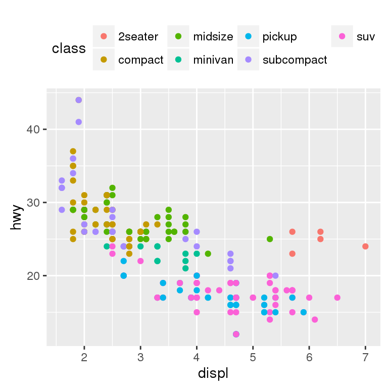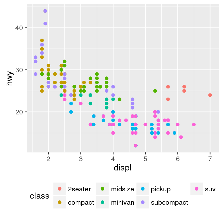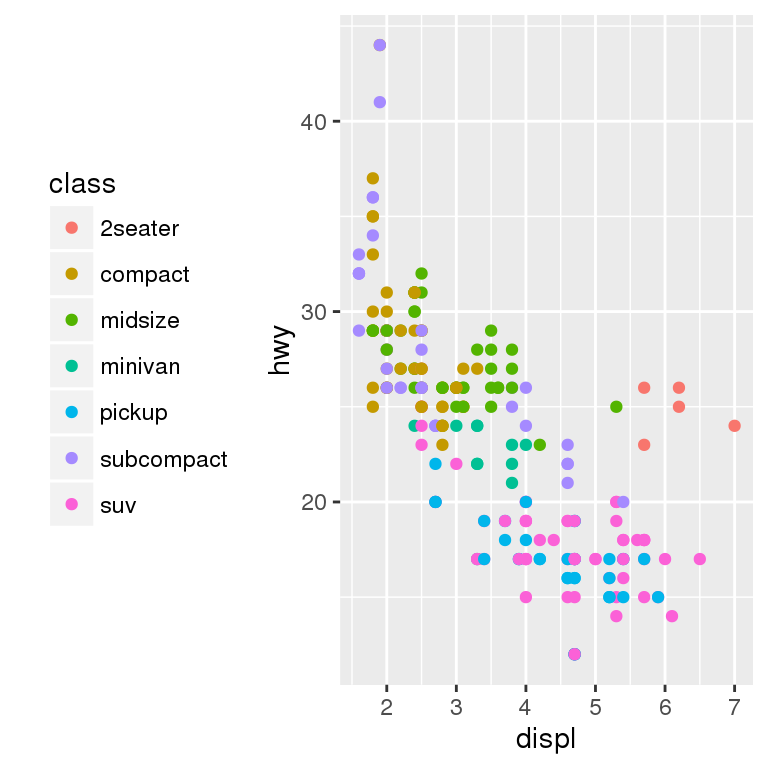ggplot(mpg, aes(displ, hwy, colour = class)) +