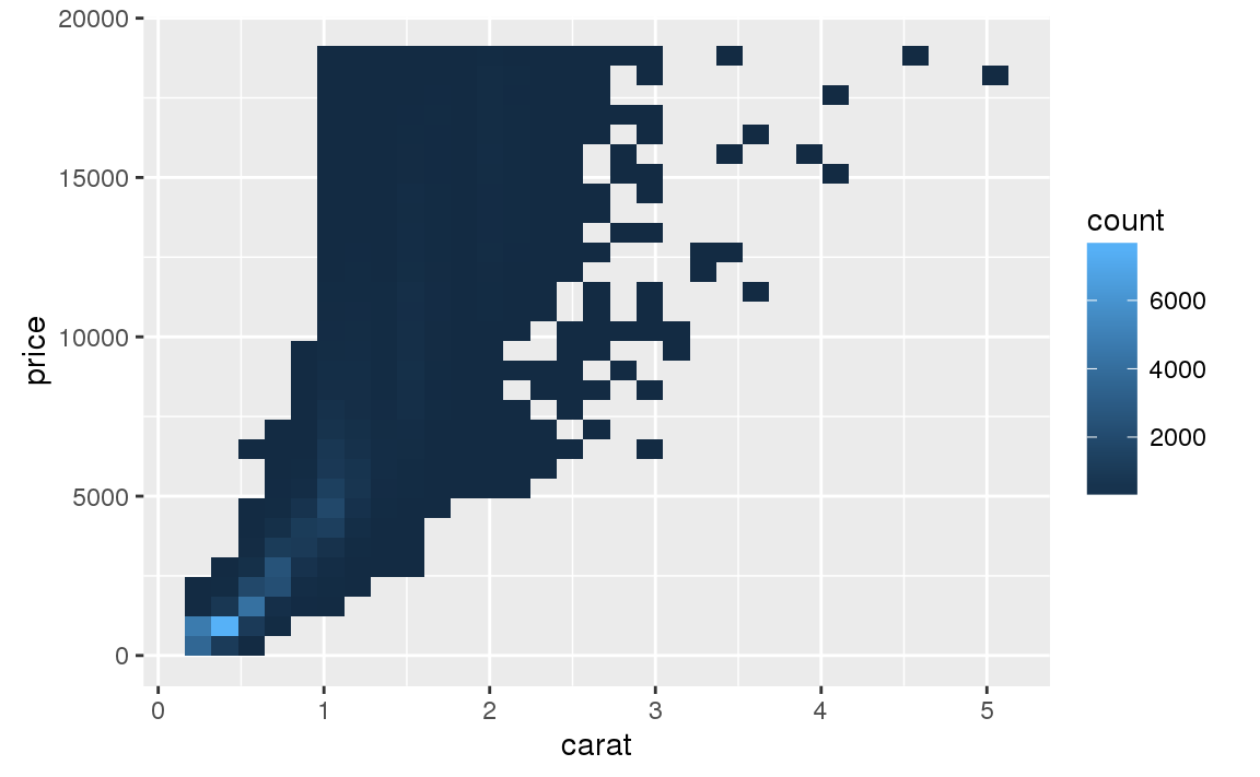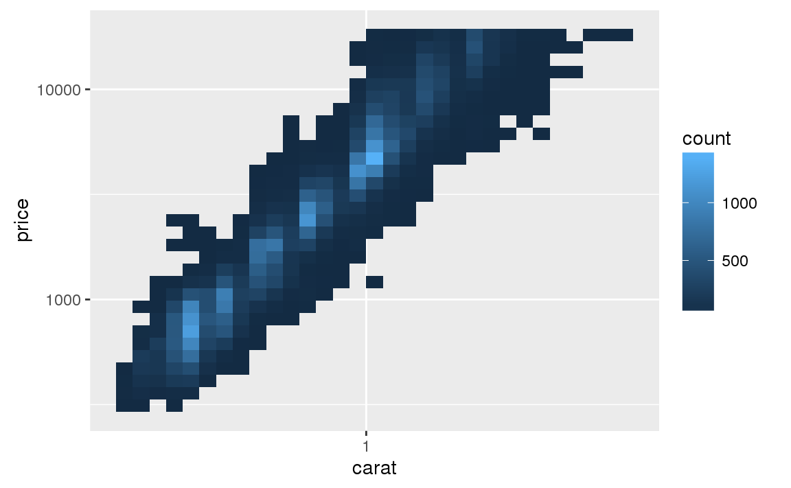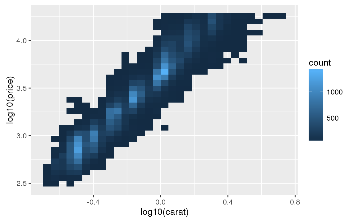 However, the disadvantage of this transformation is that the axes are now labelled with the transformed values, making it hard to interpret the plot. Instead of doing the transformation in the aesthetic mapping, we can instead do it with the scale. This is visually identical, except the axes are labelled on the original data scale.