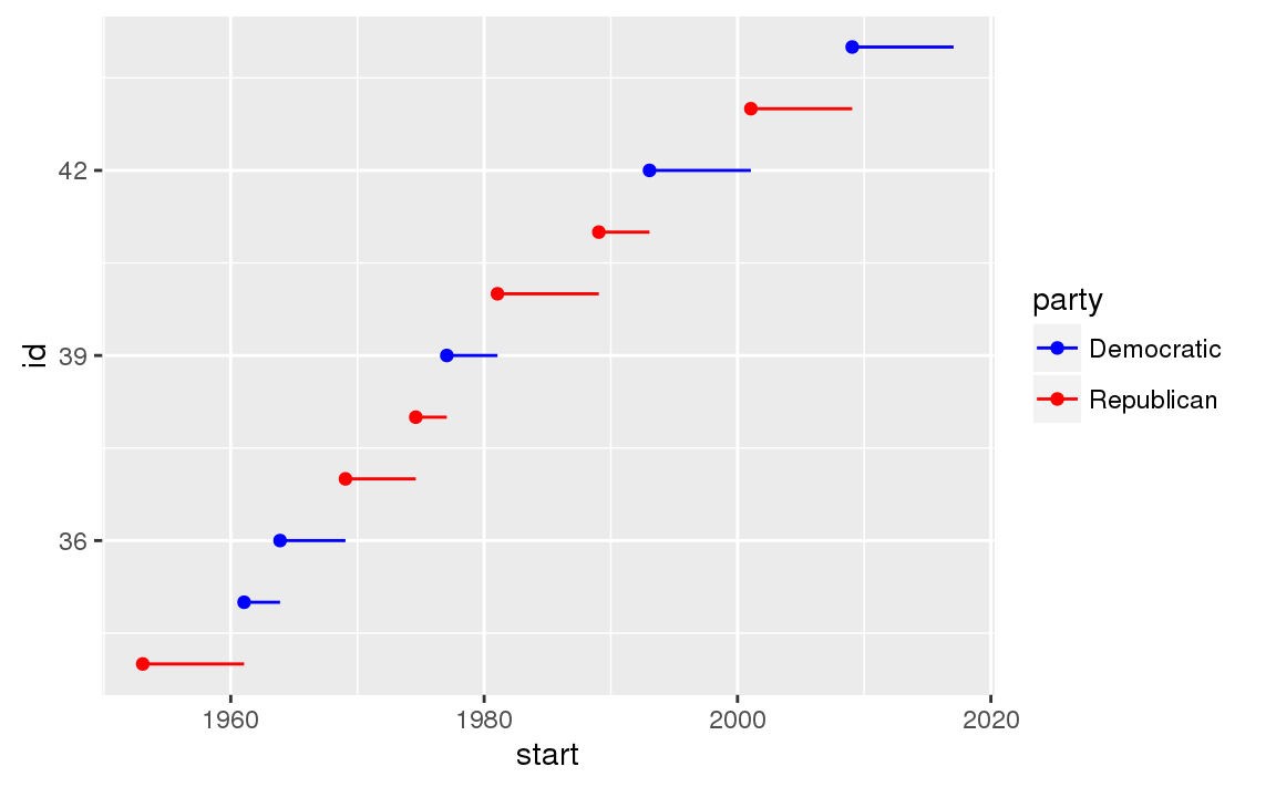 When you have a predefined mapping between values and colours, use scale_colour_manual(). For example, if we map presidential party to colour, we want to use the standard mapping of red for Republicans and blue for Democrats: