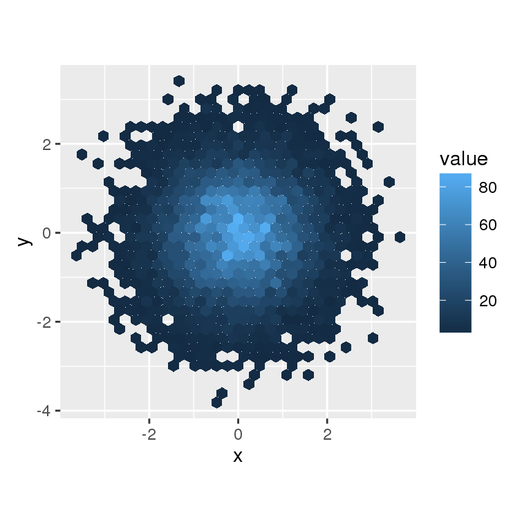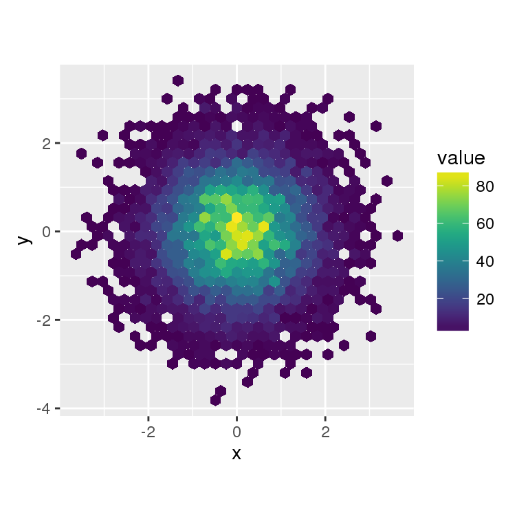 ggplot(df, aes(x, y)) + geom_hex() + scale_colour_gradient(low = "white", high = "red") + coord_fixed()What is the first argument to every scale? How does it compare to