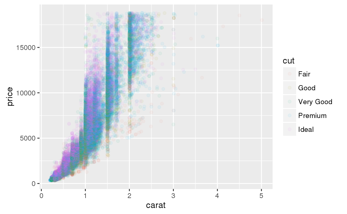 override.aesto make the legend on the following plot easier to see.ggplot(diamonds, aes(carat, price)) + geom_point(aes(colour = cut), alpha = 1/20)