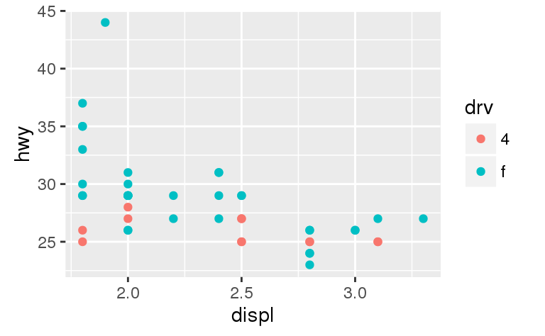 ggplot(suv, aes(displ, hwy, colour = drv)) +