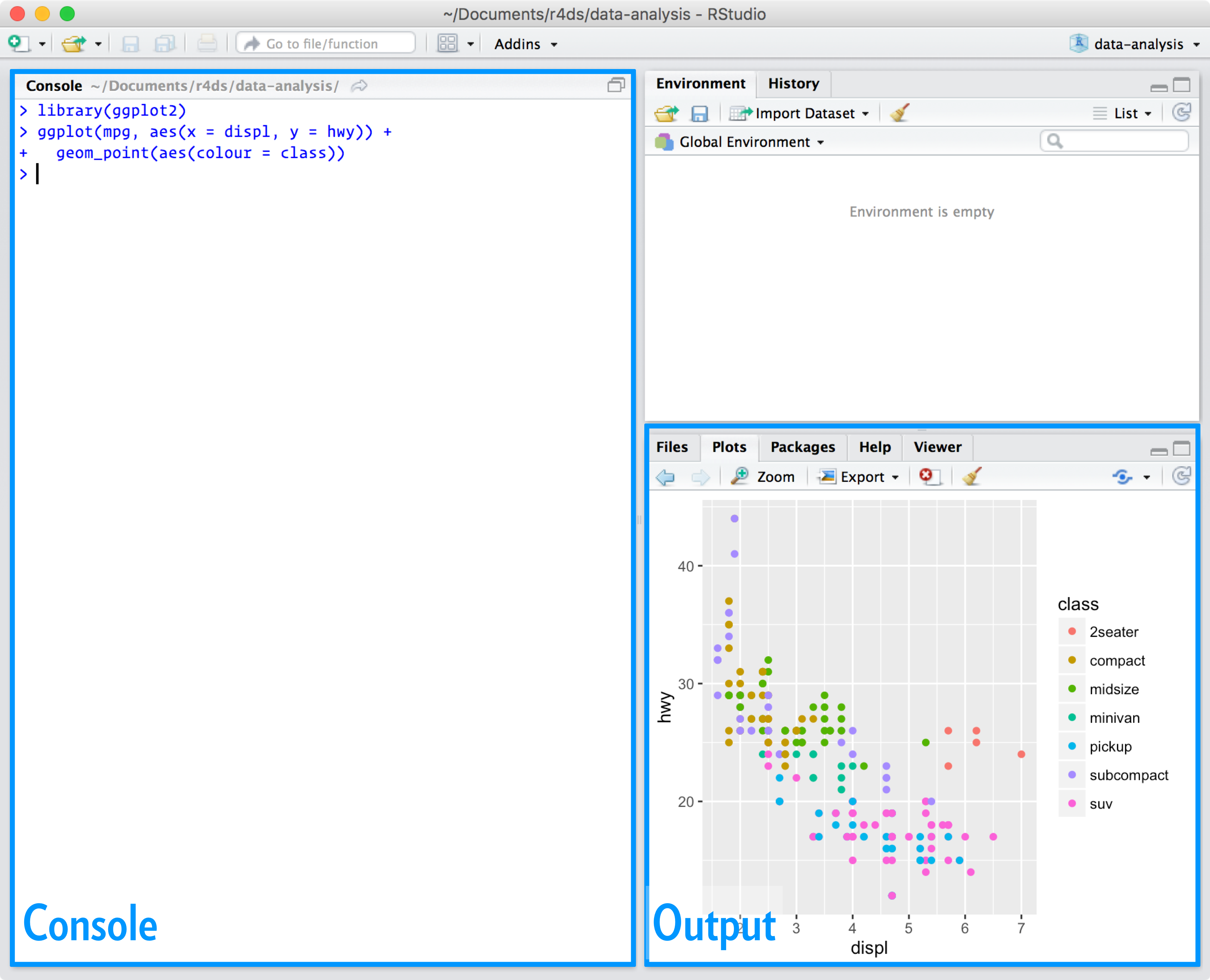 When you start RStudio, you’ll see two key regions in the interface: