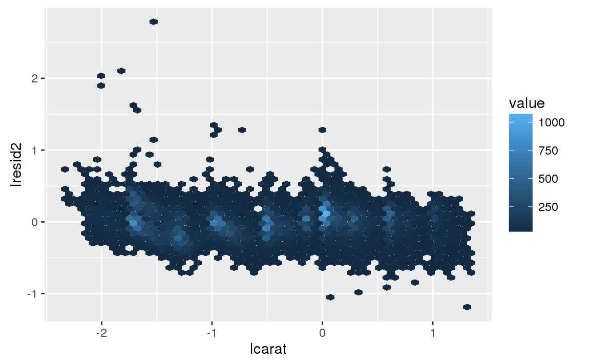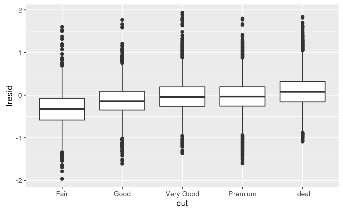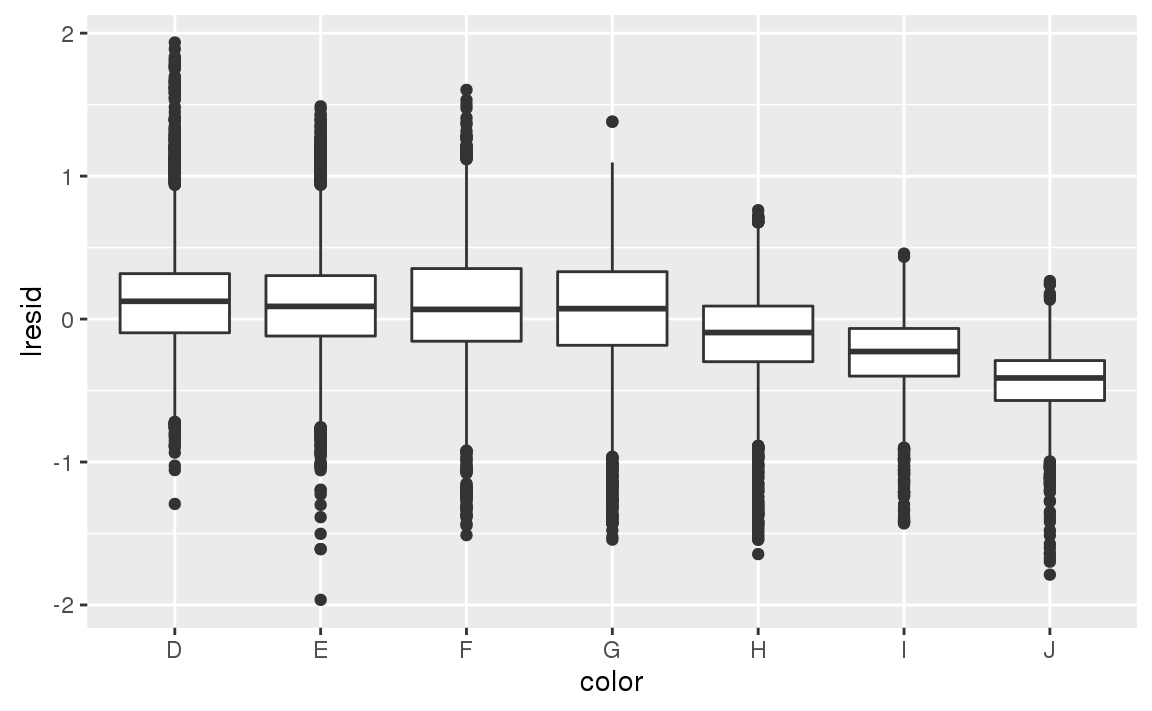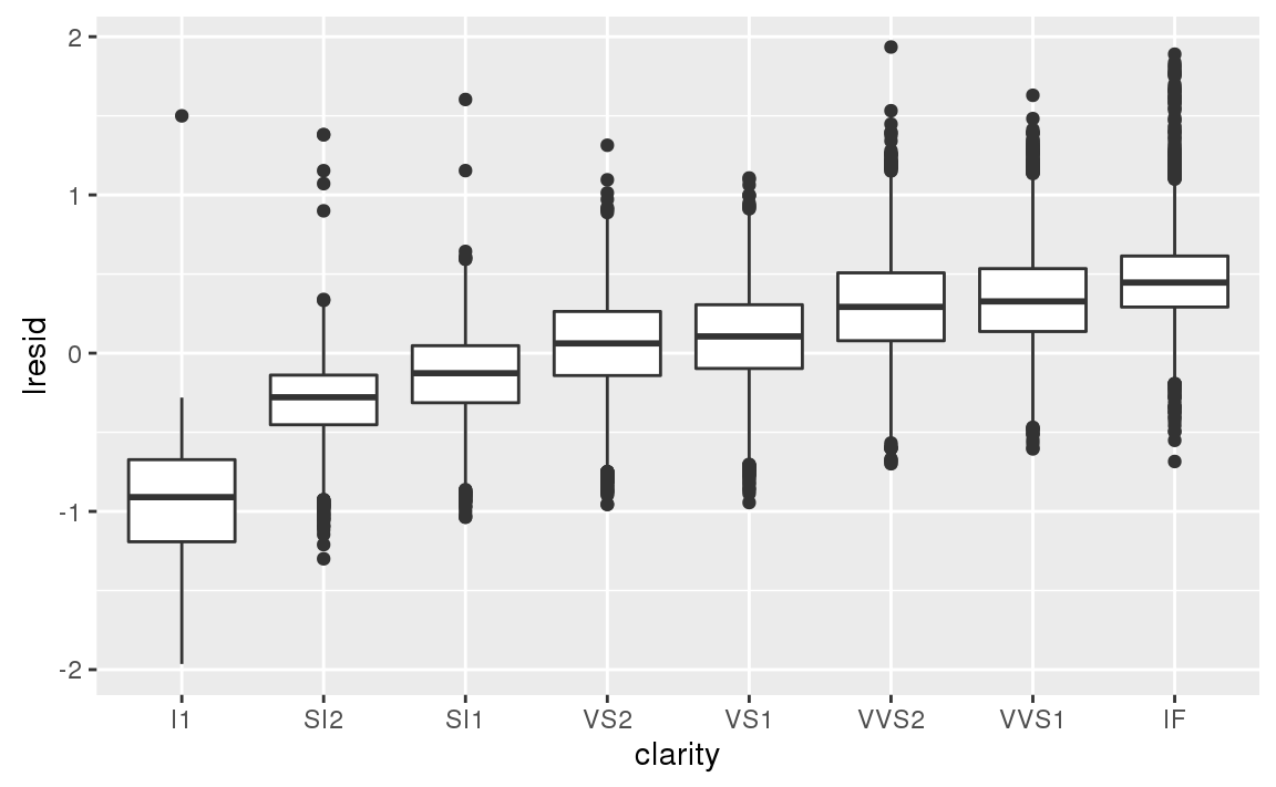 Now we see the relationship we expect: as the quality of the diamond increases, so to does it’s relative price. To interpret the y axis, we need to think about what the residuals are telling us, and what scale they are on. A residual of -1 indicates that lprice was 1 unit lower than a prediction based solely on its weight. \(2^{-1}\) is 1/2, points with a value of -1 are half the expected price, and residuals with value 1 are twice the predicted price.