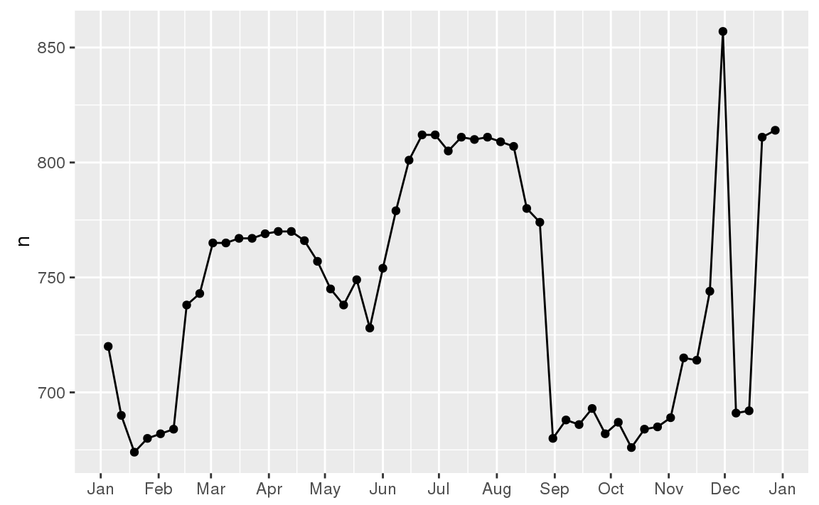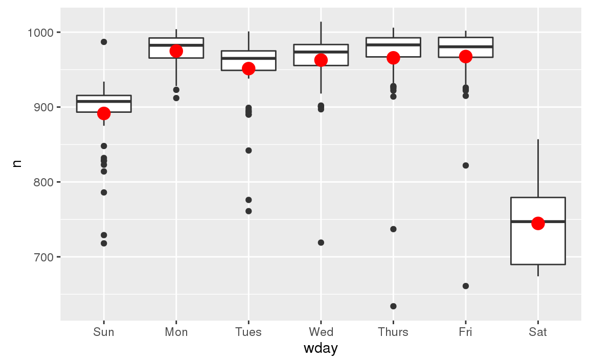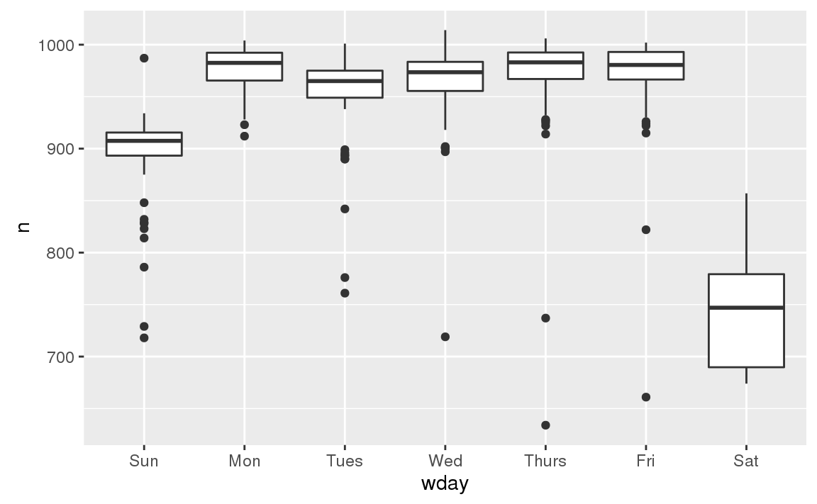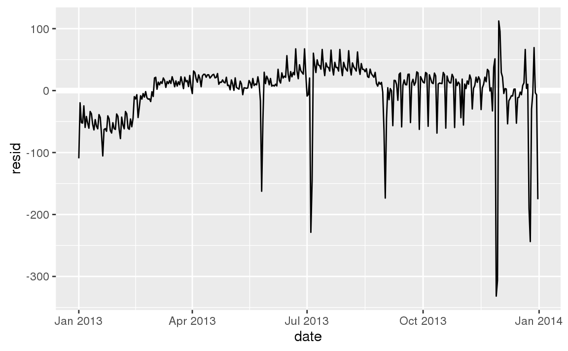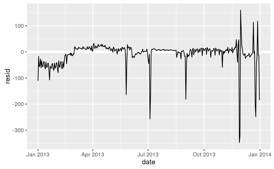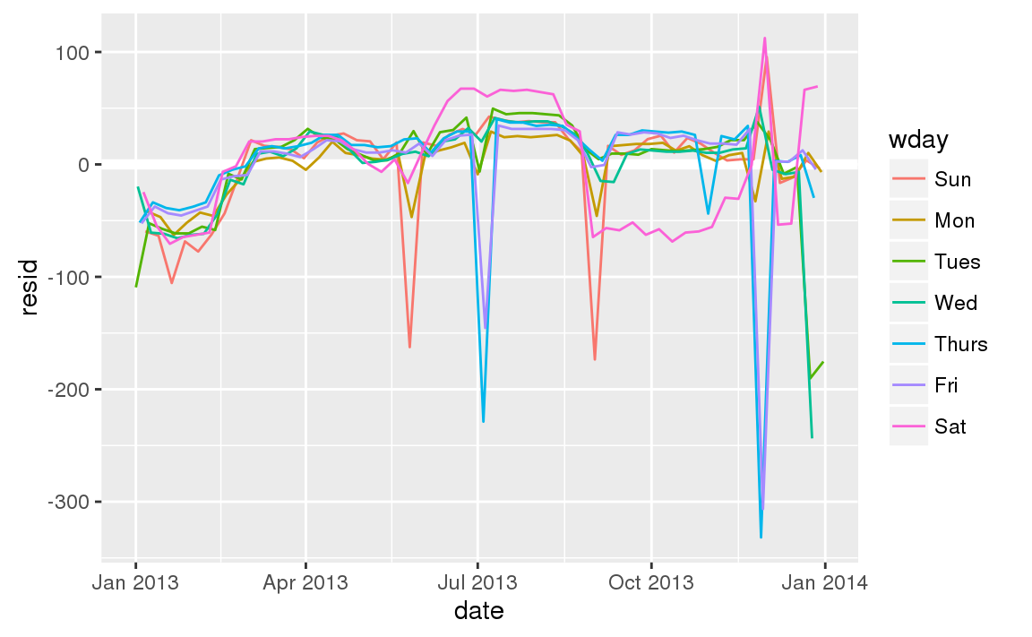 daily %>% filter(resid < -100) #> # A tibble: 11 × 4 #> date n wday resid #> <date> <int> <ord> <dbl> #> 1 2013-01-01 842 Tues -109 #> 2 2013-01-20 786 Sun -105 #> 3 2013-05-26 729 Sun -162 #> 4 2013-07-04 737 Thurs -229 #> 5 2013-07-05 822 Fri -145 #> 6 2013-09-01 718 Sun -173 #> # ... with 5 more rowsIf you’re familiar with American public holidays, you might spot New Year’s day, July 4th, Thanksgiving and Christmas. There are some others that don’t seem to correspond to public holidays. You’ll work on those in one of the exercises.
