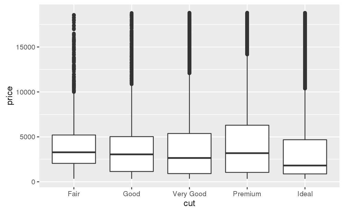 ggplot(diamonds, aes(cut, price)) + geom_boxplot()