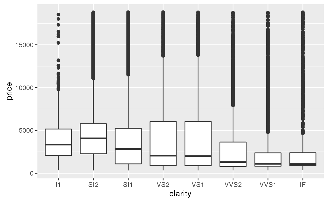 ggplot(diamonds, aes(clarity, price)) + geom_boxplot()