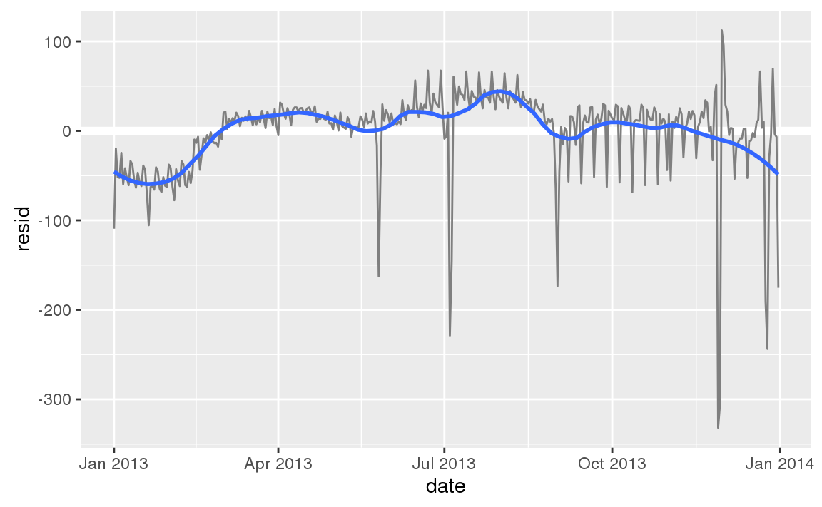 geom_smooth():daily %>% ggplot(aes(date, resid)) + geom_ref_line(h = 0) + geom_line(colour = "grey50") + geom_smooth(se = FALSE, span = 0.20)