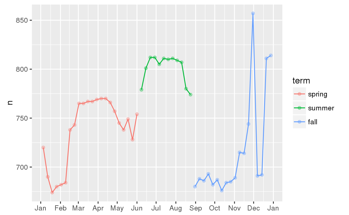 Lets create a “term” variable that roughly captures the three school terms, and check our work with a plot: