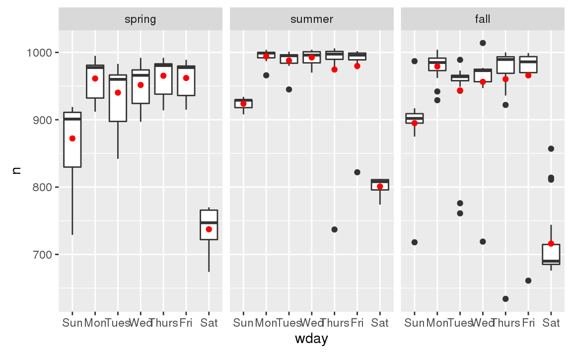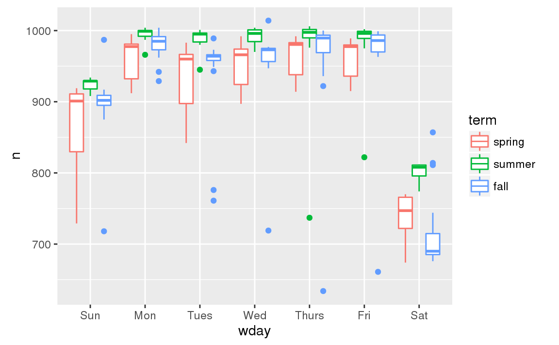 daily %>% top_n(3, resid) #> # A tibble: 3 × 5 #> date n wday resid term #> <date> <int> <ord> <dbl> <fctr> #> 1 2013-11-30 857 Sat 112.4 fall #> 2 2013-12-01 987 Sun 95.5 fall #> 3 2013-12-28 814 Sat 69.4 fallCreate a new variable that splits the