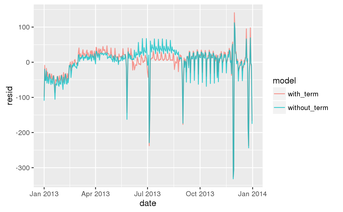 mod3 <- lm(n ~ wday2(date) * term(date), data = daily)Either approach is reasonable. Making the transformed variable explicit is useful if you want to check your work, or use them in a visualisation. But you can’t easily use transformations (like splines) that return multiple columns. Including the transformations in the model function makes life a little easier when you’re working with many different datasets because the model is self contained.
