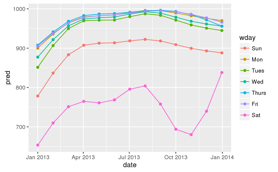 I suspect this pattern is caused by summer holidays: many people go on holiday in the summer, and people don’t mind travelling on Saturdays for vacation. Looking at this plot, we might guess that summer holidays are from early June to late August. That seems to line up fairly well with the state’s school terms: summer break in 2013 was Jun 26–Sep 9.