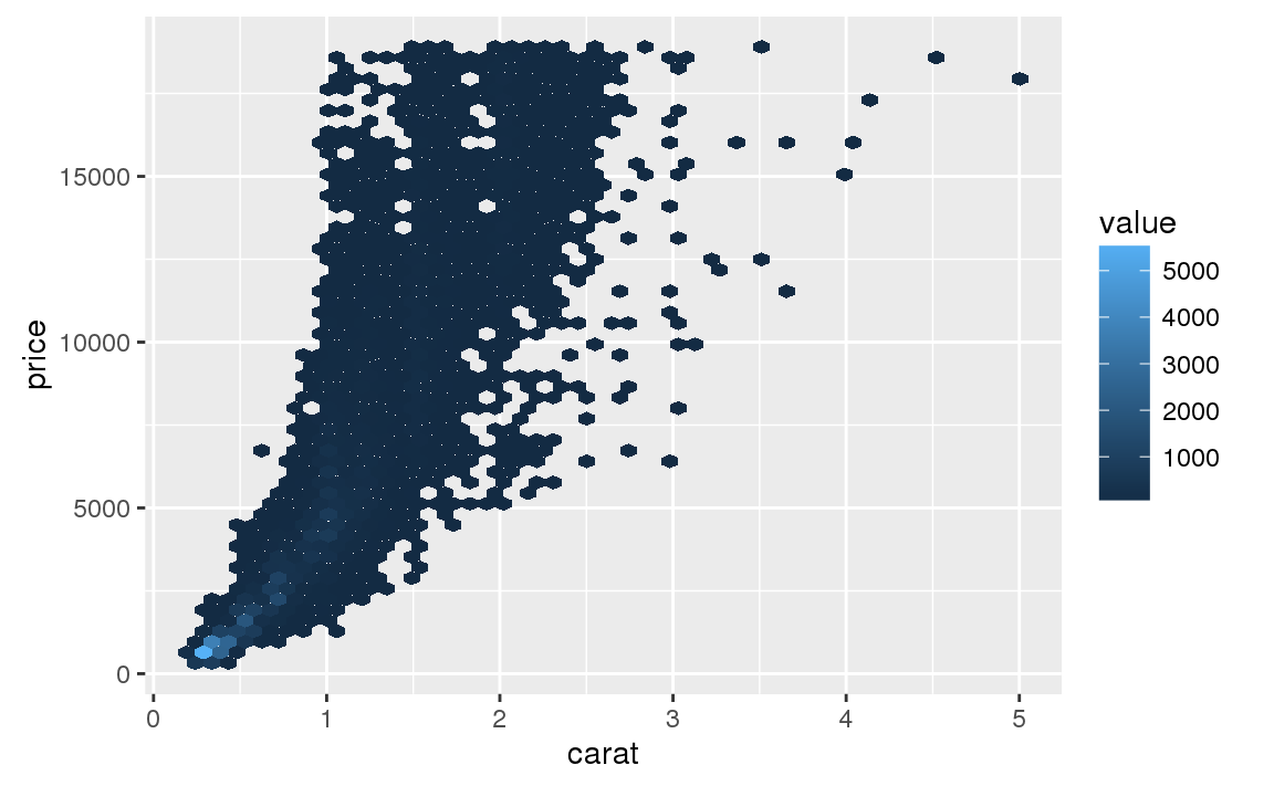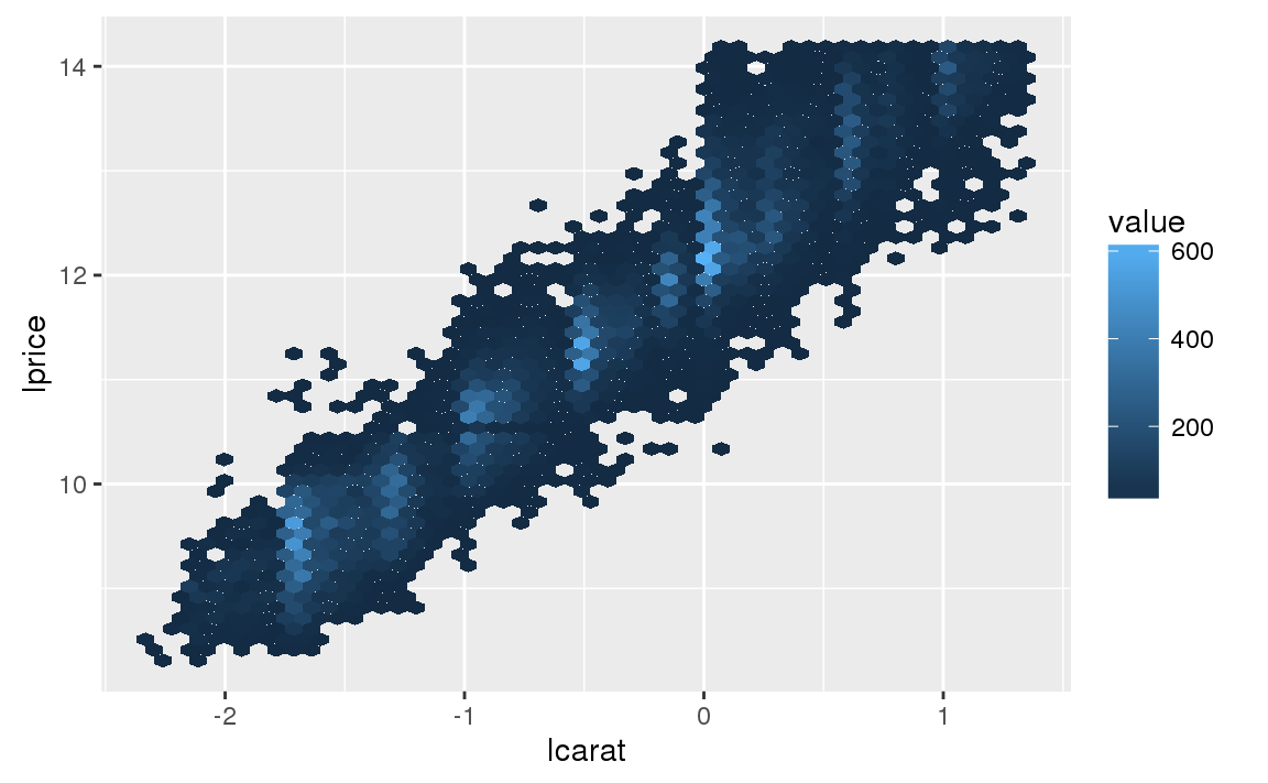 mutate(lprice = log2(price), lcarat = log2(carat))Together, these changes make it easier to see the relationship between carat and price: