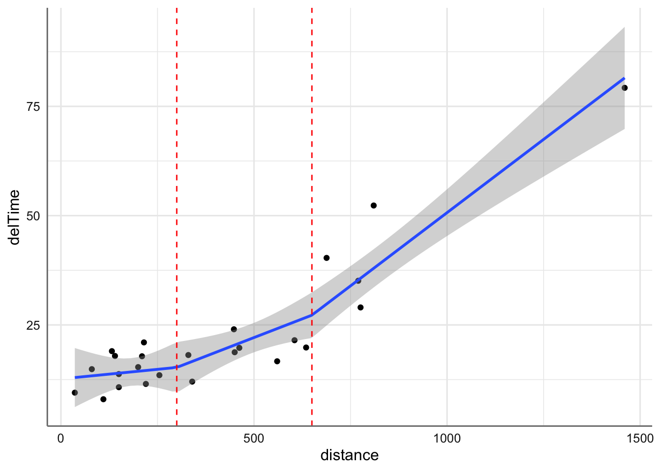 Podemos probar aún otra modelización alternativa. Volvemos al descriptivo y podríamos marcar tres zonas de comportamiento para la relación distance-delTime; esto nos llevaría a categorizar la variable distance en tres niveles y modelizar cada zona por separado en base a la información disponible