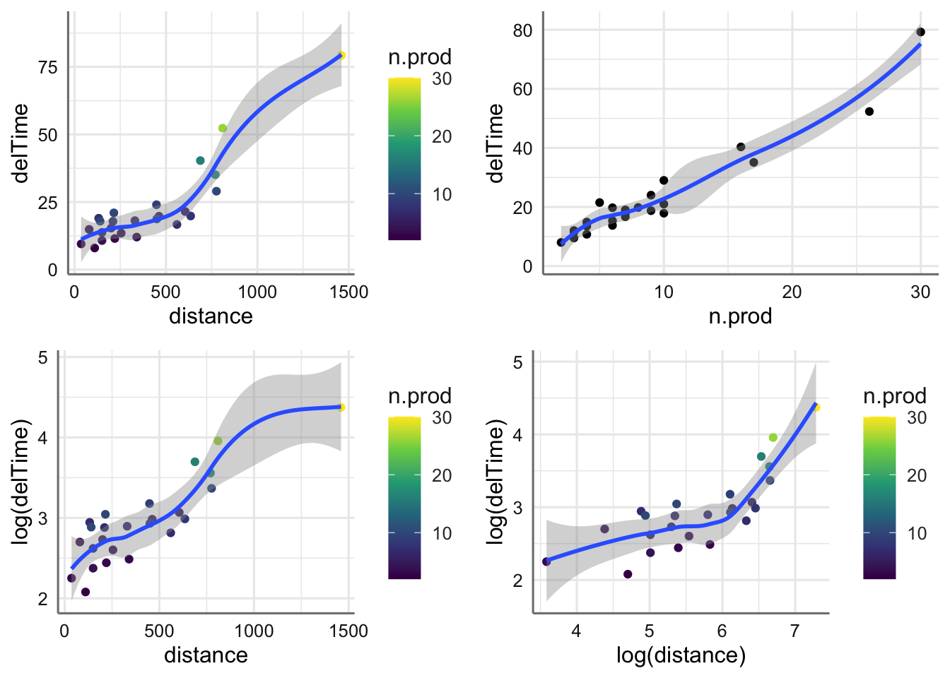 g2=ggplot(delivery,aes(x=n.prod,y=delTime))+
