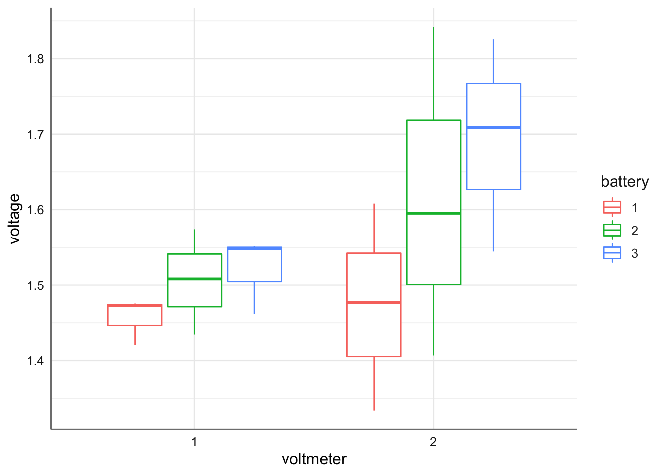 ggplot(batteries,aes(voltmeter,voltage))+geom_boxplot(aes(colour=battery))
