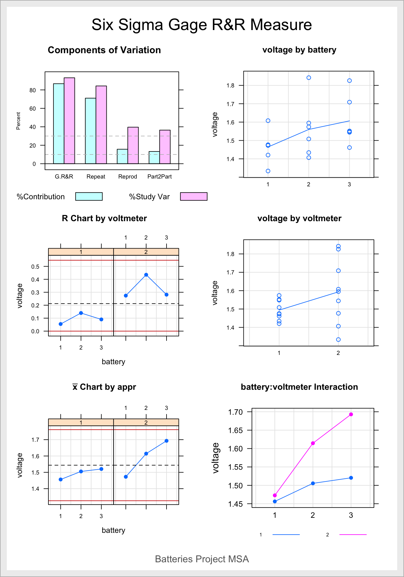 Ejemplo 5.1 (voltaje en pilas, de Cano et al 2013) proporciona un ejemplo desarrollado para el cálculo del estudio Gage R&R completo. Un fabricante de baterías hace varios tipos de baterías/pilas para uso doméstico. El BB de la compañía quiere empezar un proyecto Seis Sigma para mejorar la línea de producción de las pilas de voltaje 1.5. Ha relacionado la CTQ identificada en la fase I (Definir) mediante la variable output “voltaje”. Ahora el sistema de medida ha de ser evaluado antes de comenzar otros análisis. Hay 2 voltímetros disponibles y 3 pilas diferentes son seleccionadas al azar al final de la línea de producción. Se mide el voltaje de cada pila con cada voltímetro 3 veces. Los datos son los siguientes: