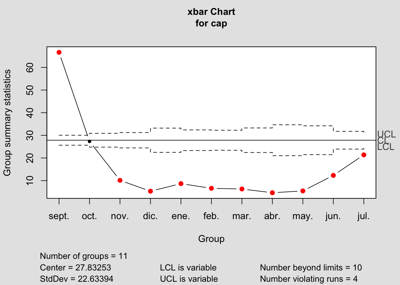 Donde comprobamos la buena capacidad del sistema para cumplir con las especificaciones de los clientes durante los meses de diciembre a mayo \(C_{pk}=2.78\), mientras que el sistema a largo plazo considerando todo el curso académico, es incapaz de cumplir, como indica el índice de capacidad \(P_{pk}=0.327\). Es posible pues, que el sistema funcione eficientemente (buena capacidad potencial), pero hay que estabilizar el proceso y corregir (reducir) la alta variabilidad durante los meses críticos de junio a noviembre.