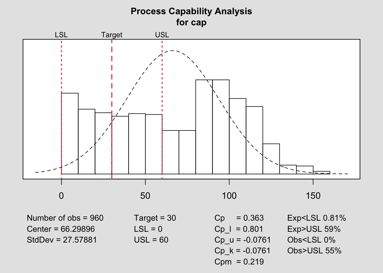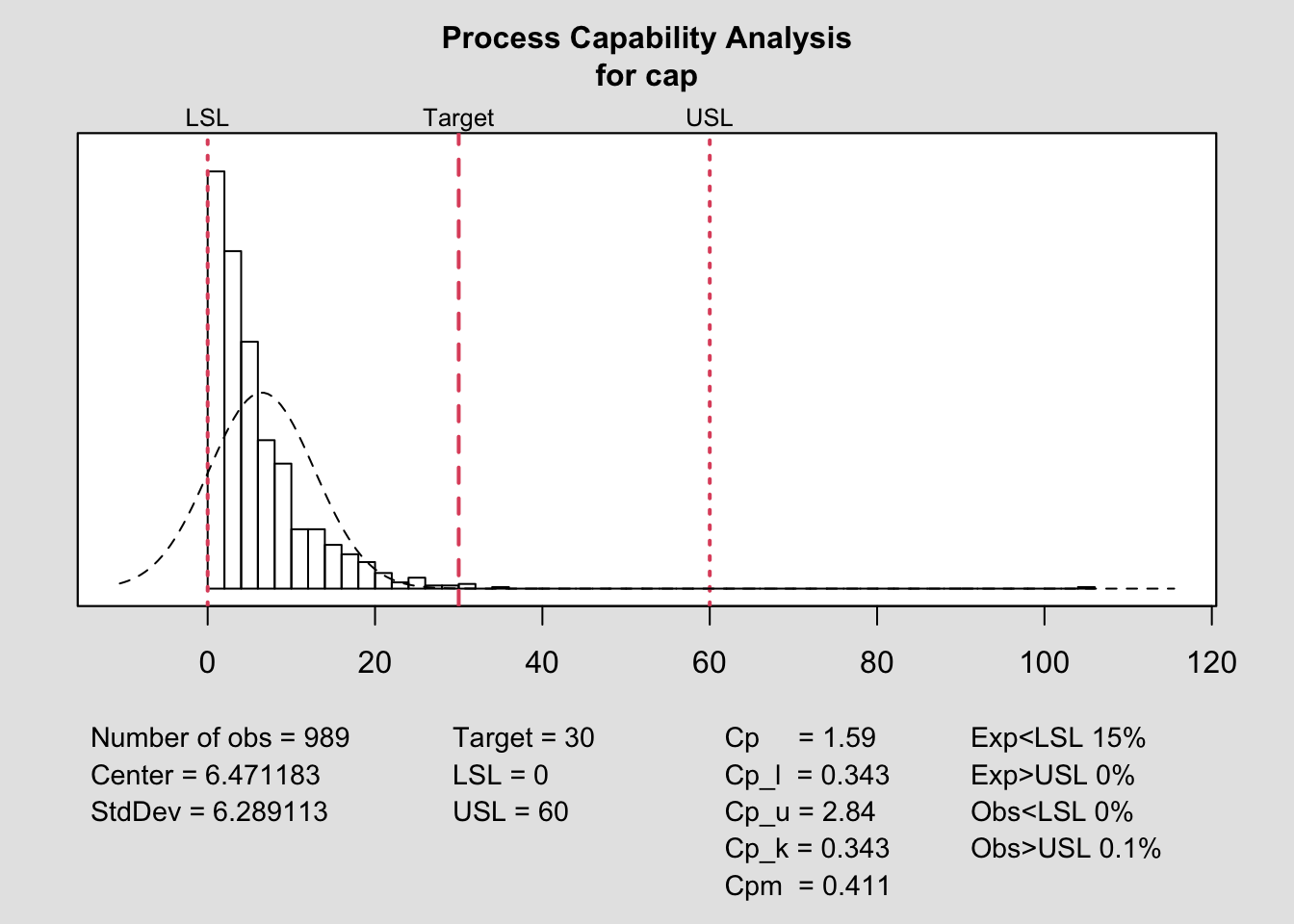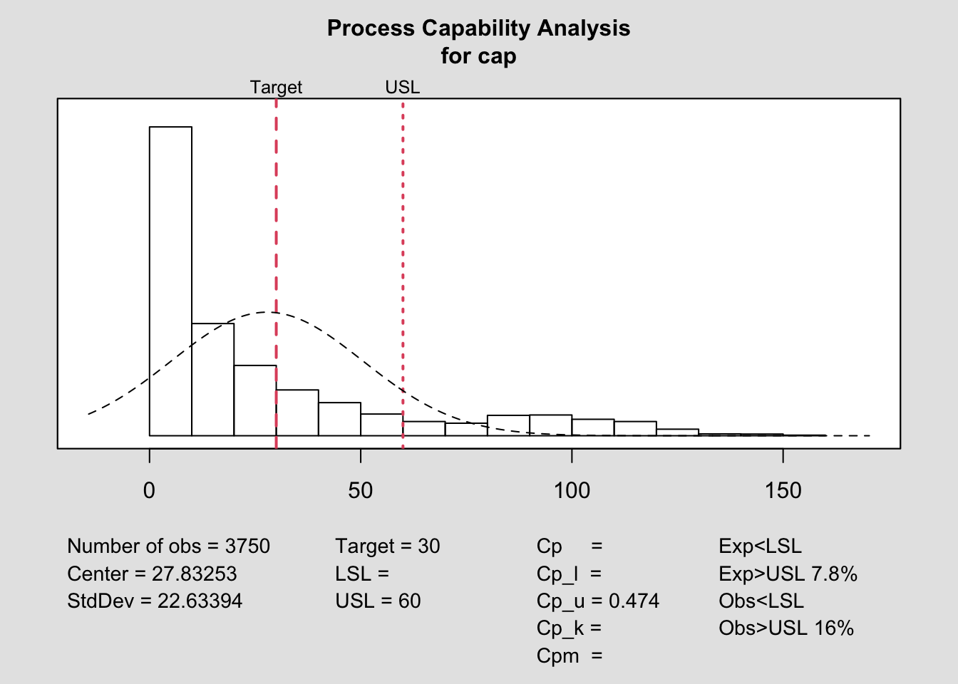 process.capability(q, spec.limits=c(0,usl),target=target)