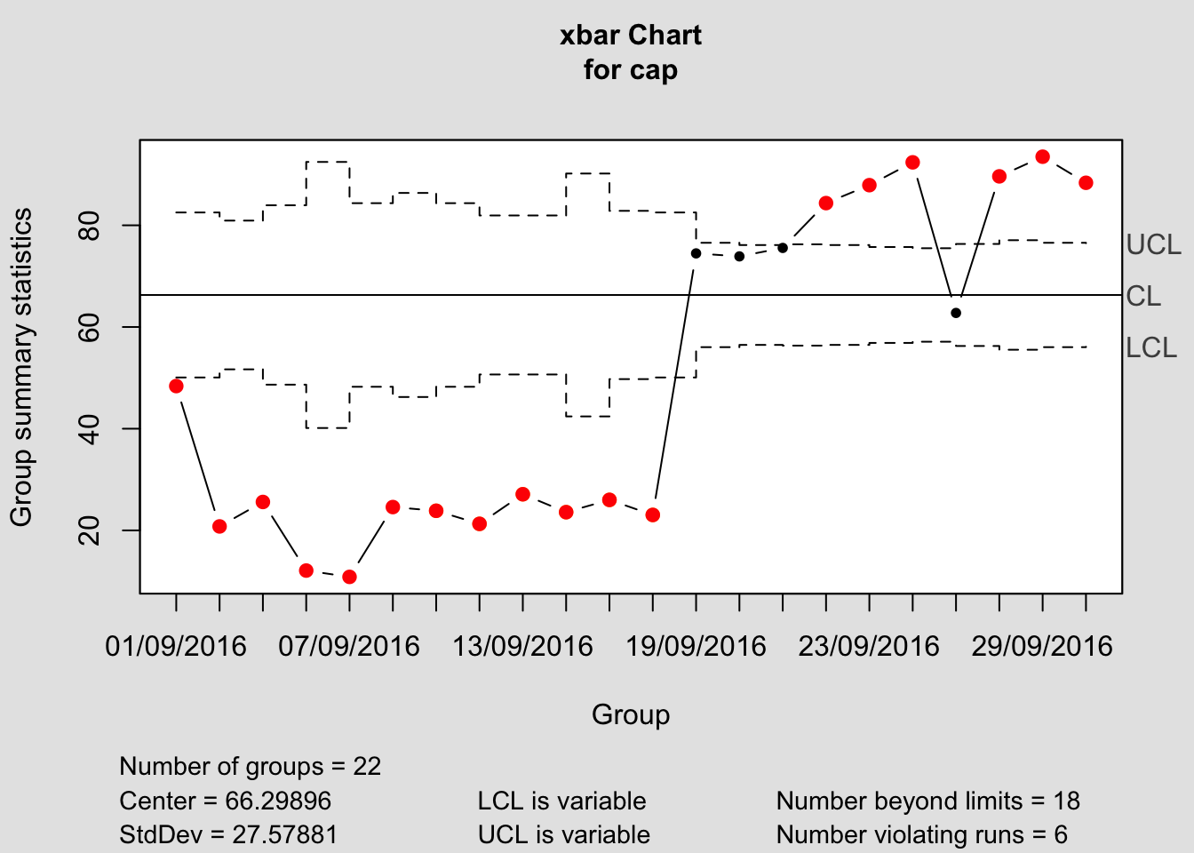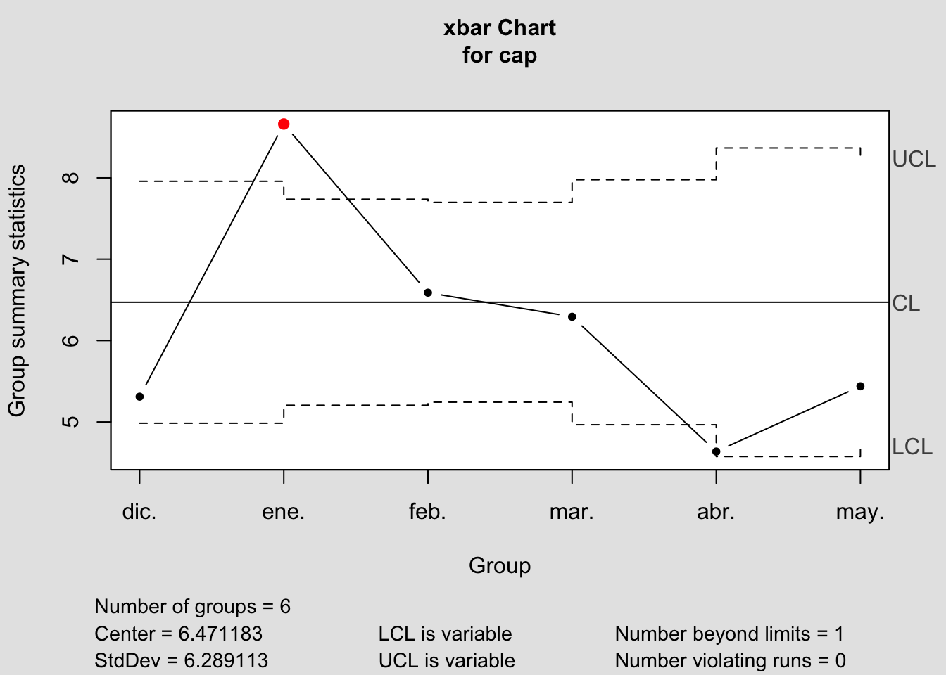 q <- qcc(cap, type="xbar", nsigmas=3, plot=TRUE)