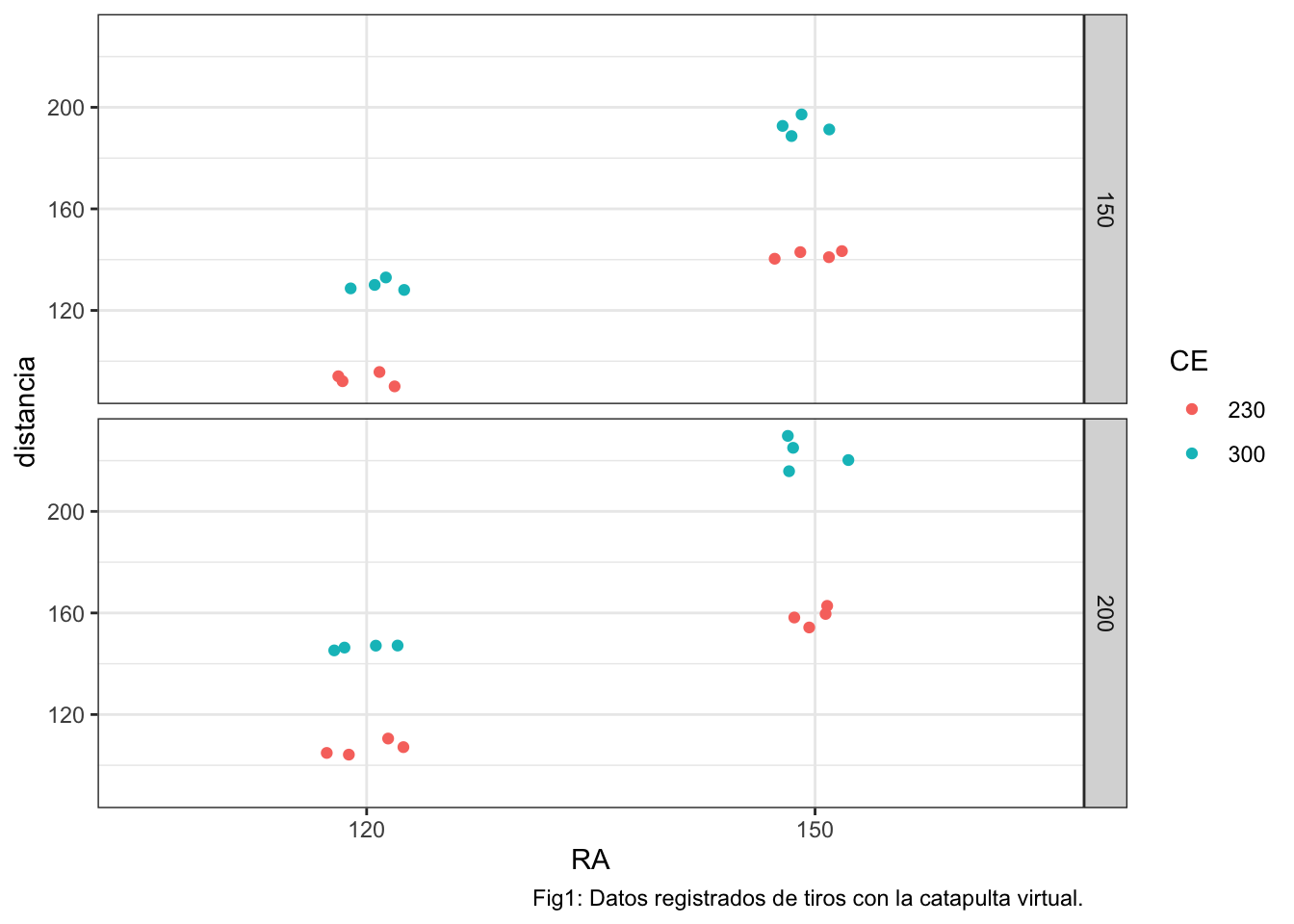 labs(caption="Fig1: Datos registrados de tiros con la catapulta virtual.")