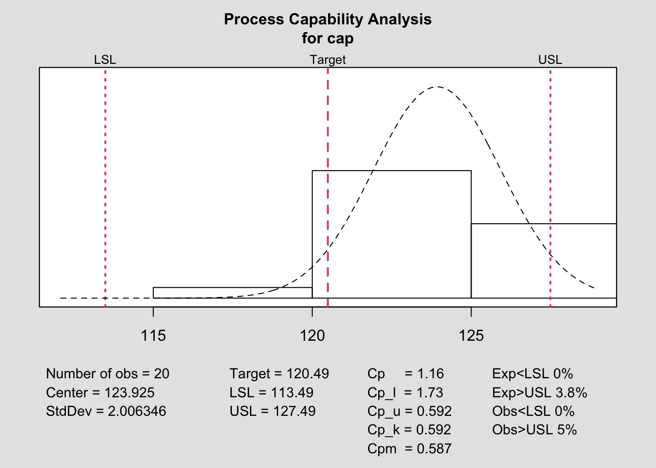 process.capability(q, spec.limits=c(lsl,usl),target=target)