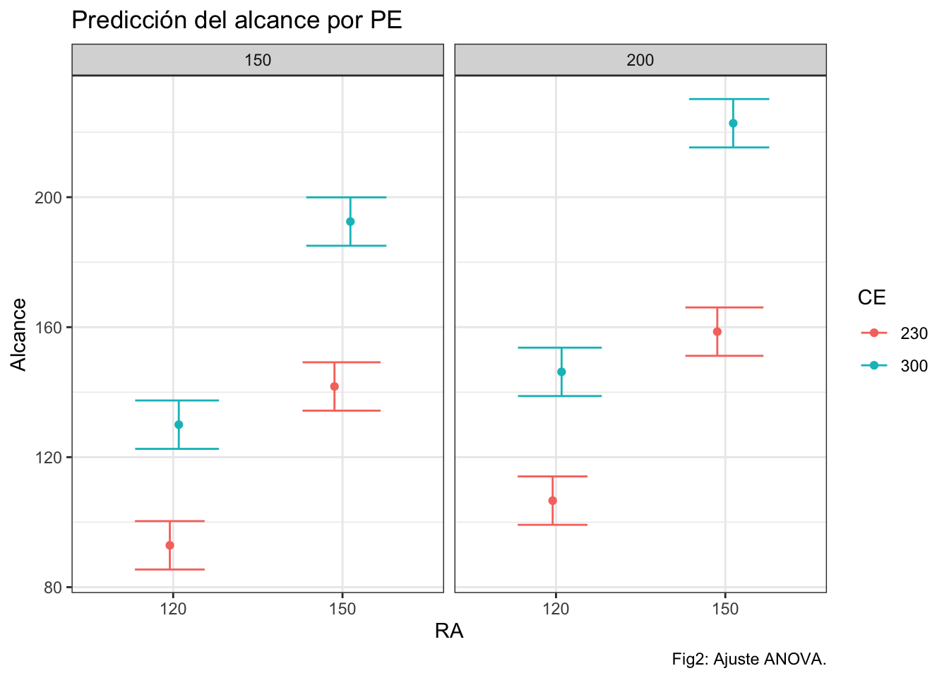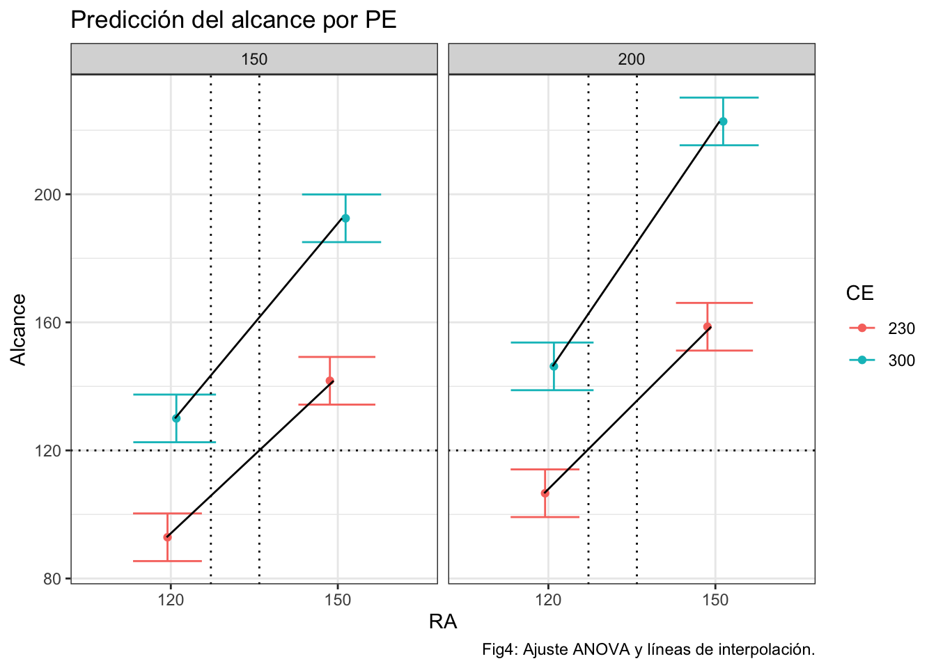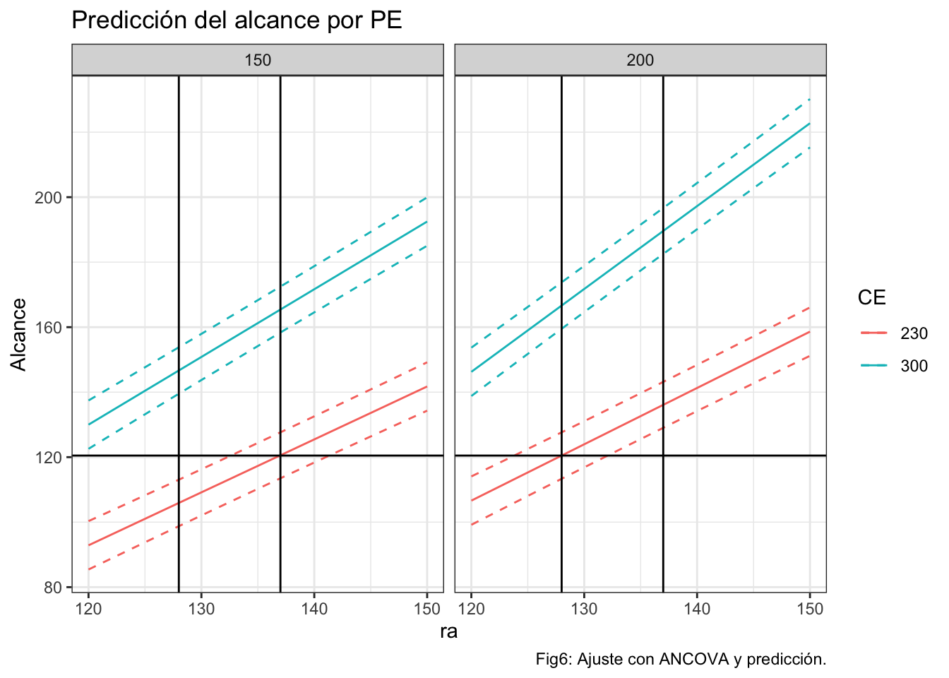 caption="Tabla1: Predicción del alcance en función de la configuración PE, CE, RA.")ggplot(prediccionr,aes(x=ra,y=pred.fit,group=CE))+